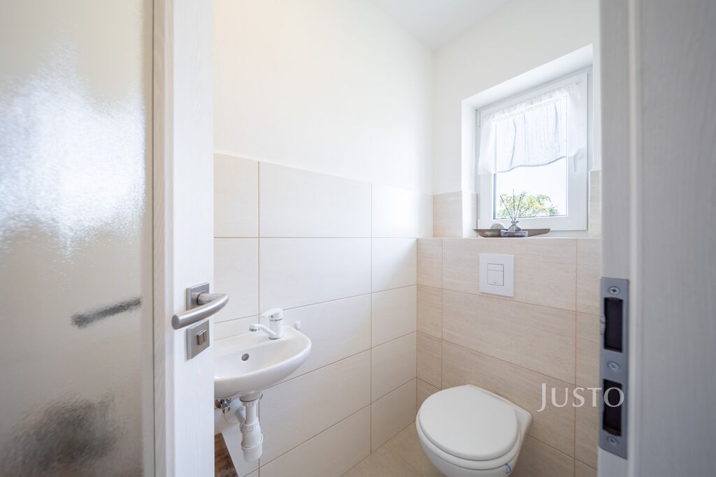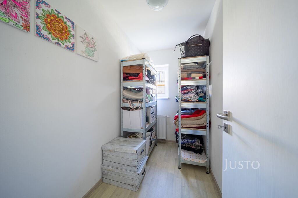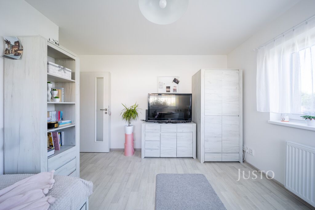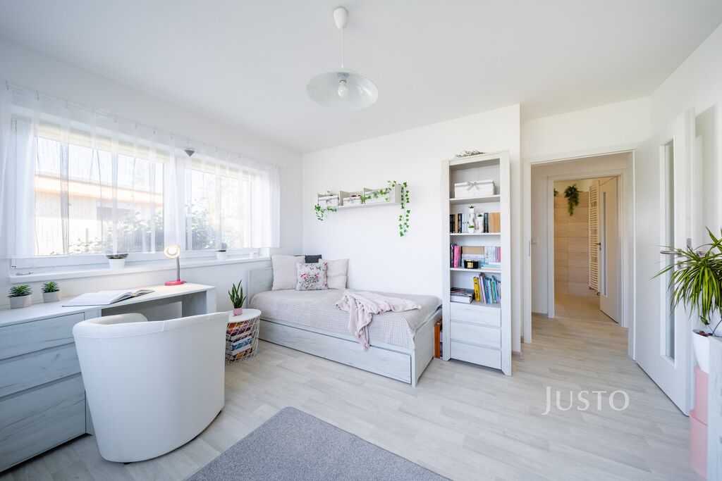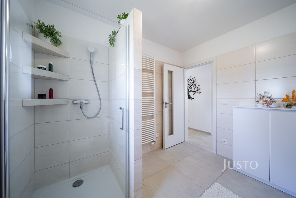 K dispozici jsou dvě samostatné ložnice – hlavní ložnice a druhý pokoj, který může sloužit jako dětský pokoj, pracovna nebo pokoj pro hosty. Komfortní zázemí zajišťuje elegantní koupelna s prostorným sprchovým koutem, umyvadlem a toaletou, kterou doplňuje ještě druhá, samostatná toaleta s umyvadlem. Praktická šatna a technická místnost pak výrazně usnadní každodenní fungování.