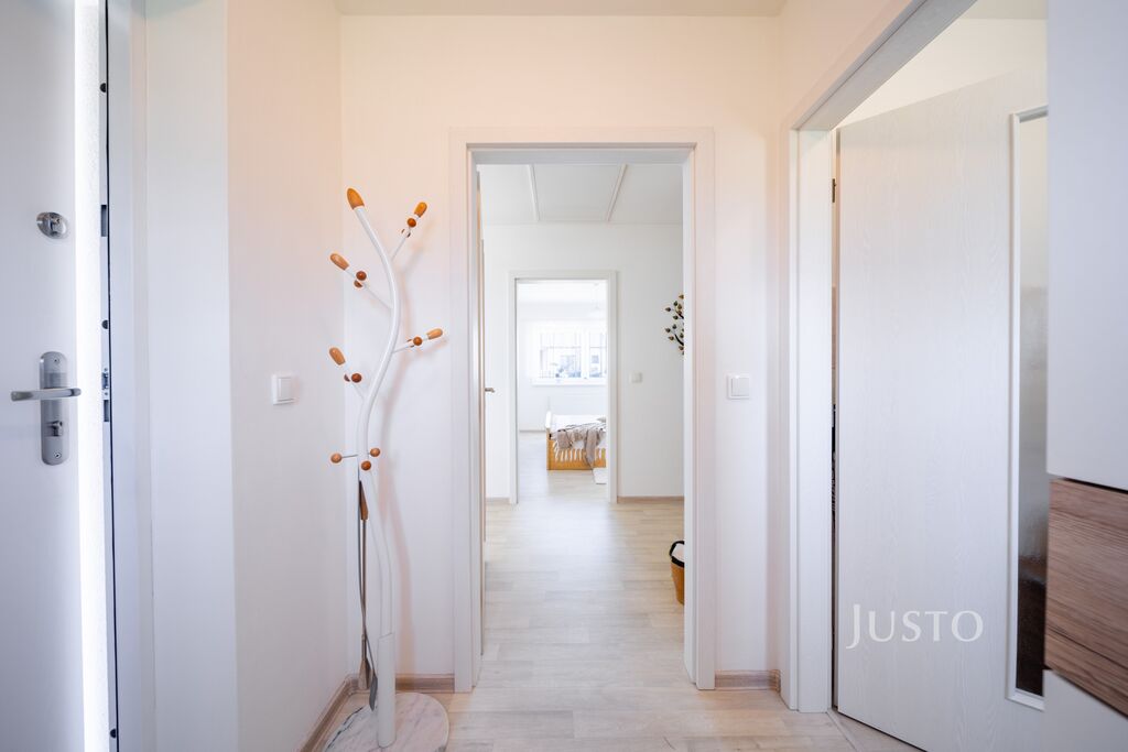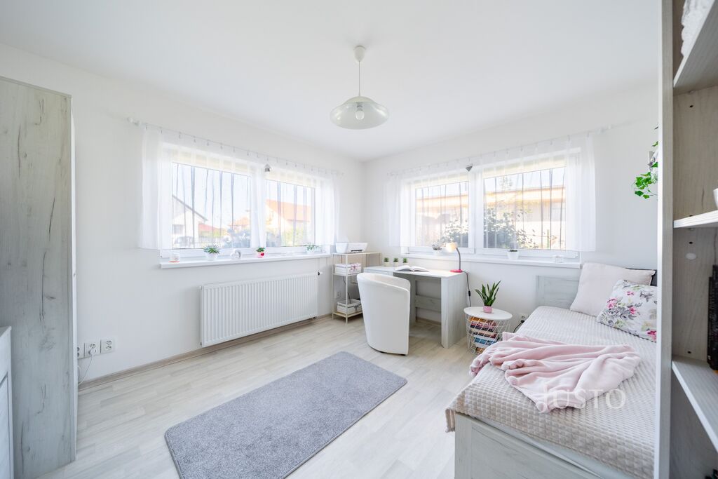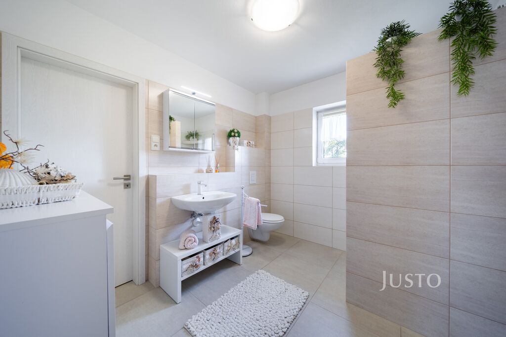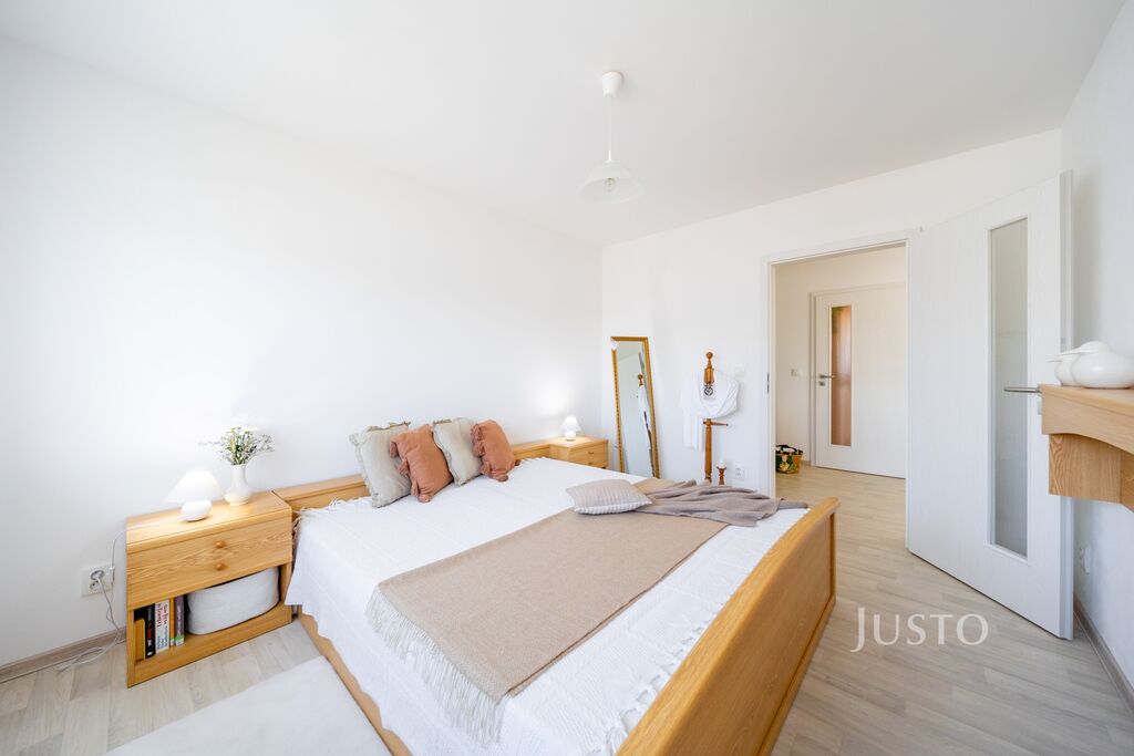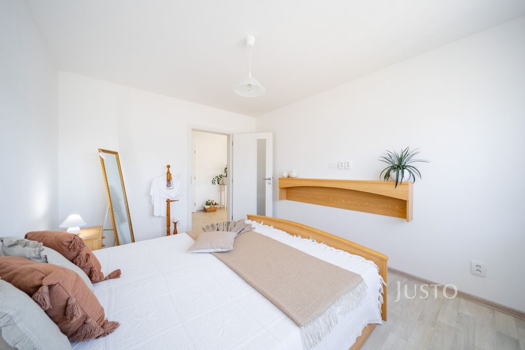 K dispozici jsou dvě samostatné ložnice – hlavní ložnice a druhý pokoj, který může sloužit jako dětský pokoj, pracovna nebo pokoj pro hosty. Komfortní zázemí zajišťuje elegantní koupelna s prostorným sprchovým koutem, umyvadlem a toaletou, kterou doplňuje ještě druhá, samostatná toaleta s umyvadlem. Praktická šatna a technická místnost pak výrazně usnadní každodenní fungování.