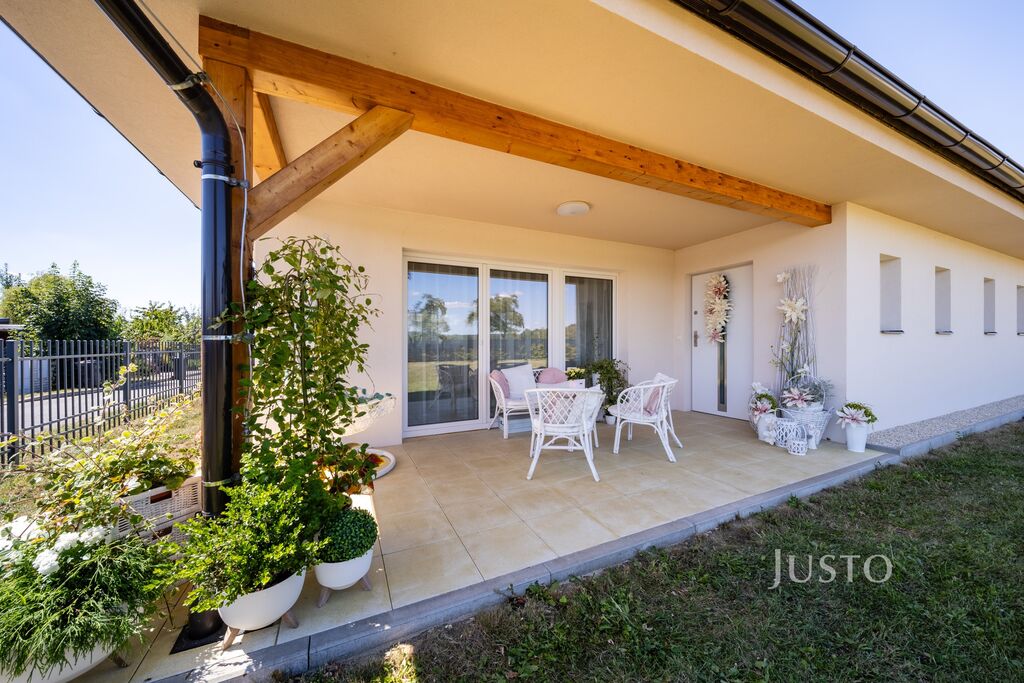 Interiér domu vás přivítá přirozeným světlem, světlými podlahami a jemnou barevností v přírodních tónech. Dominantou je prostorný obývací pokoj s krbem, kuchyňským koutem a jídelnou, odkud se francouzskými okny dostanete přímo na krytou terasu. Ta se rázem stane vaším oblíbeným místem – ať už na ranní kávu, odpolední odpočinek nebo letní grilování s přáteli.
