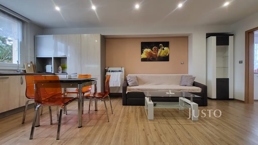 Obývací pokoj je s kuchyňským koutem. Kuchyňská linka je vybavena vestavěnými spotřebiči. Má dostatek pracovního a úložného místa. V obývací části je pohodlný gauč, konferenční stolek, televizní stolek atp.
