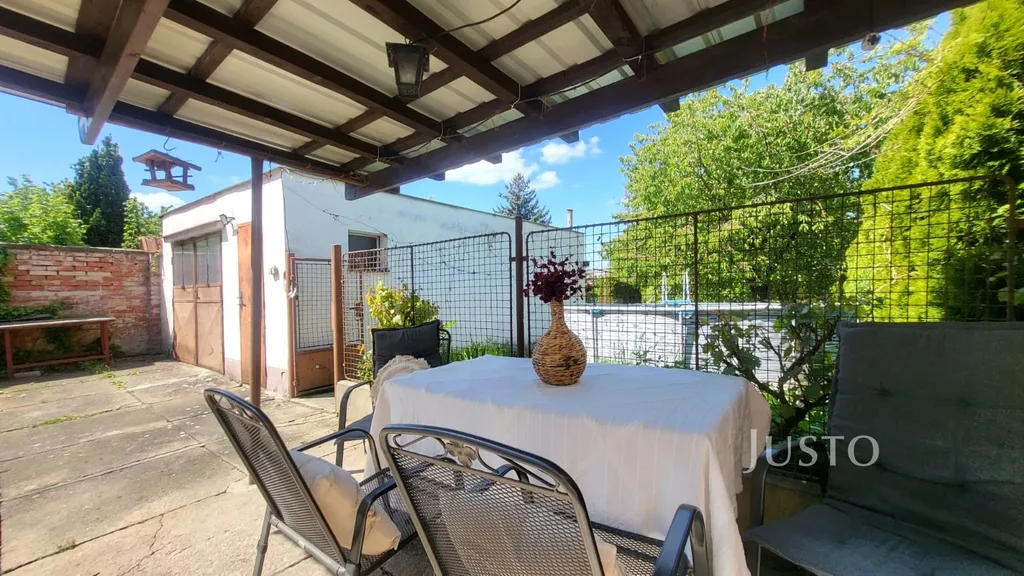 Na uzavřeném dvoře, se nachází garáž s dílnou a kryté posezení.