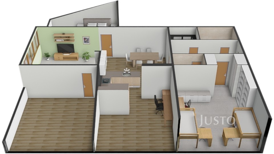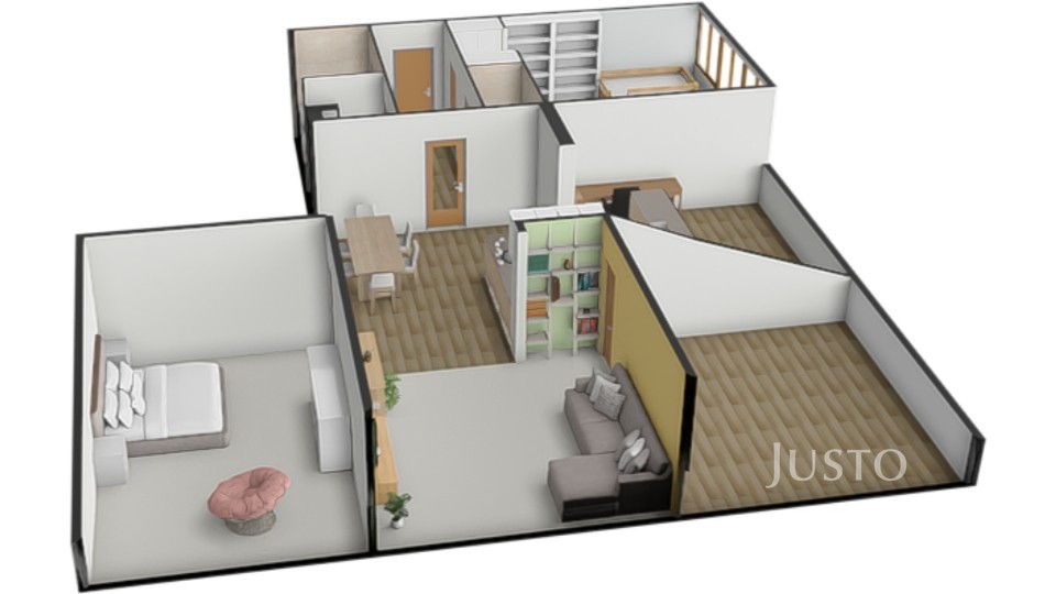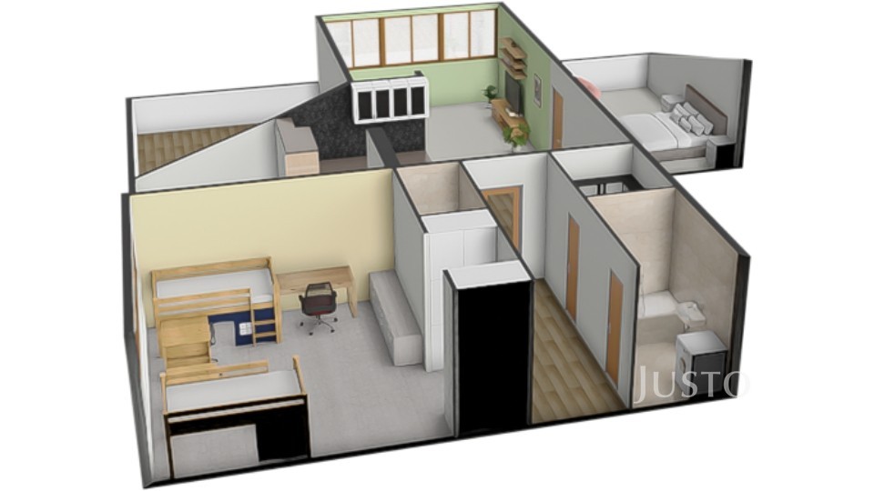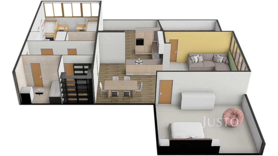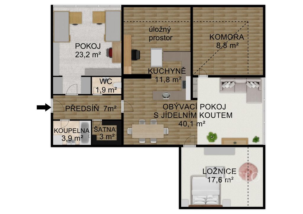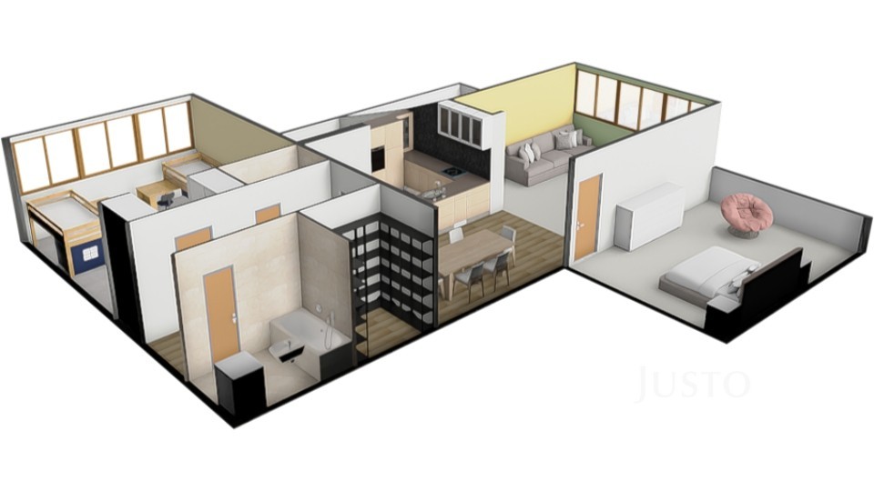 Byt je ideální volbou pro klienty, kteří ocení otevřený, vzdušný prostor pro společný rodinný život a zároveň hledají klidné zázemí v ložnicích a množství úložných řešení. Komfortní bydlení bez kompromisů.