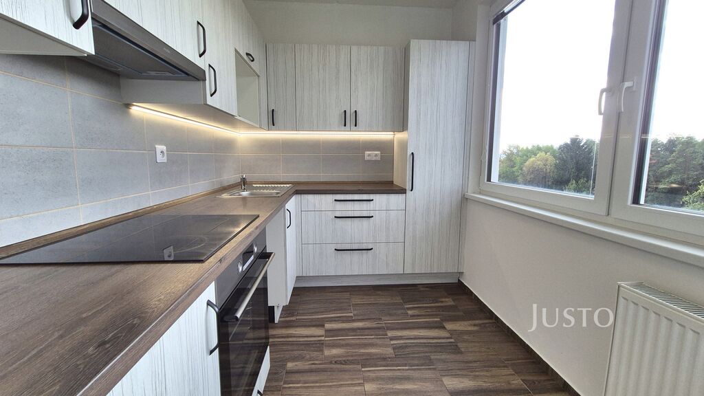 Součástí vybavení je nová kuchyňská linka s vestavnými spotřebiči (mimo myčky nádobí – pro tu jsou připravené přípojky i místo).