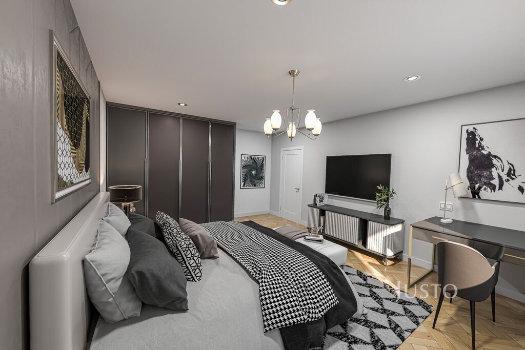 1. patro: kuchyně, obývací pokoj, ložnice, prostorná koupelna s vanou, balkon do ulice, 63,6 m²