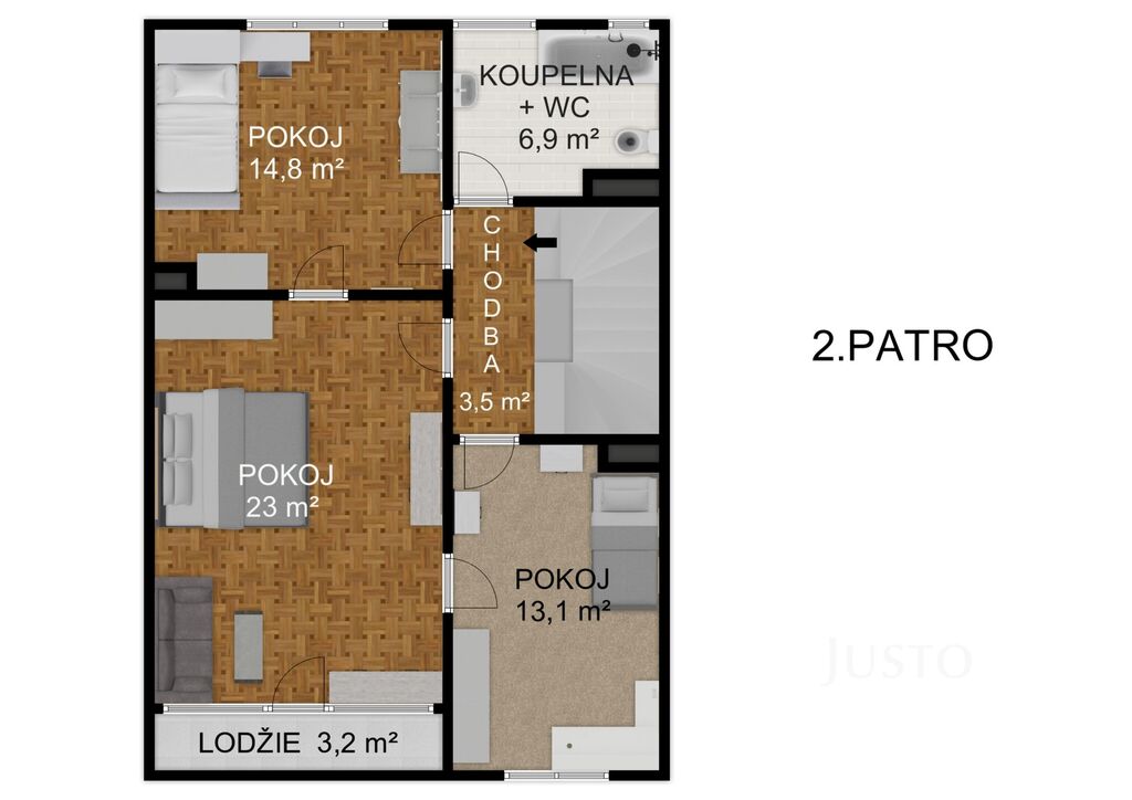 2. patro: obývací pokoj, dva pokoje, koupelna se sprchovým koutem, balkon do ulice, 59,1 m²