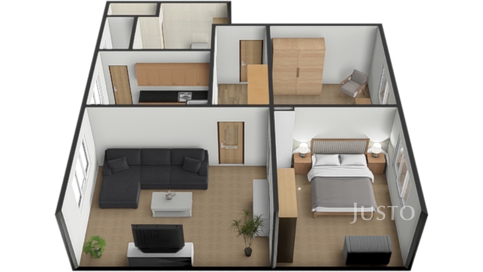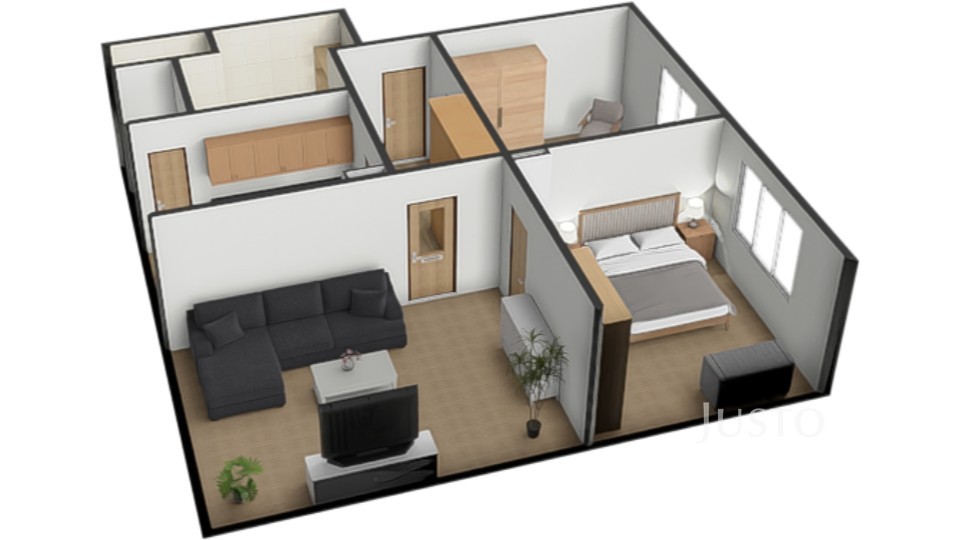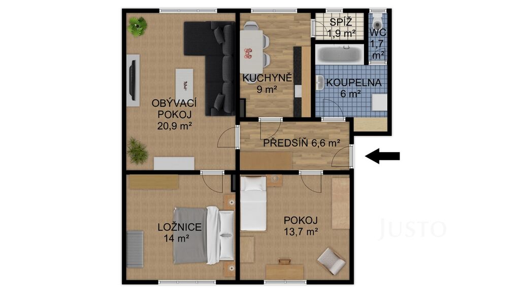 Dispoziční řešení bytu je 3+1 s užitnou plochou 72,5 m², v menším zděném domě bez výtahu.