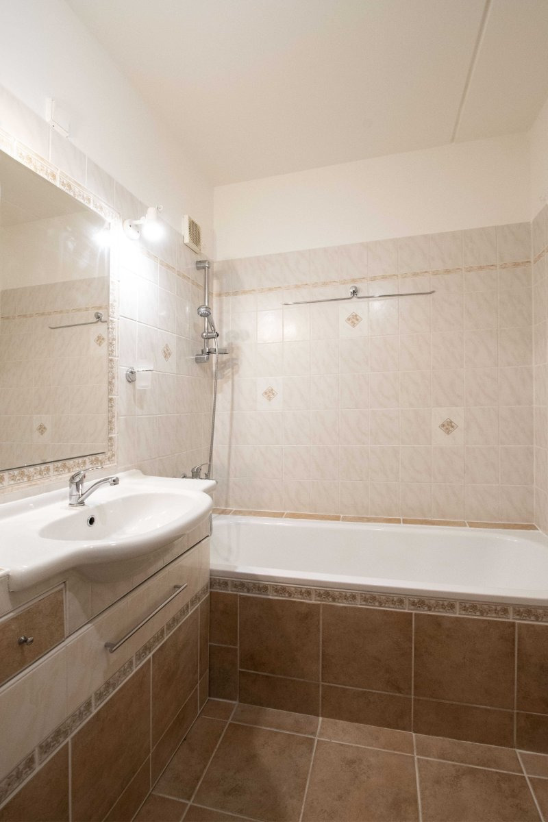 Byt se nabízí částečně vybavený. Kuchyňská linka disponuje lednicí, sporákem, digestoří, myčkou, troubou a mikrovlnou troubou. Koupelna je zařízená vanou a umyvadlem se zrcadlem. Toaleta se nachází samostatně. V bytě jsou nové podlahy. K bytu náleží také sklep.