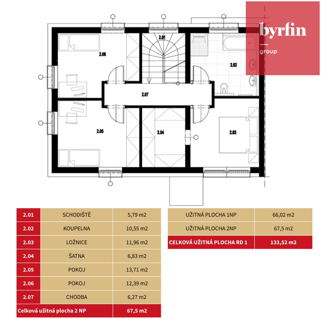 V patře jsou dva pokoje, ložnice s vlastní šatnou a komfortní koupelna s vanou, sprchovým koutem a WC – tedy koupelna i toaleta na každém patře.