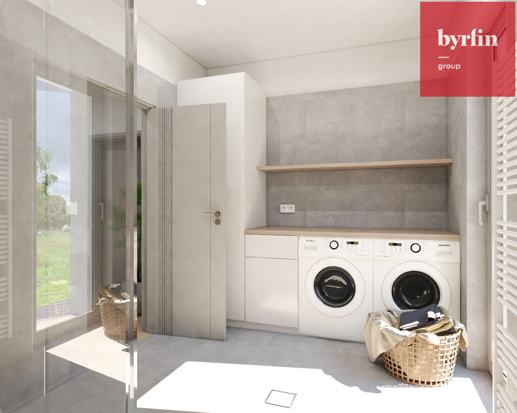 V přízemí se nachází zádveří, technická místnost, samostatné WC a prostorný obývací pokoj s kuchyní a jídelnou, který je propojen se zahradou velkoformátovými HS portálovými dveřmi.