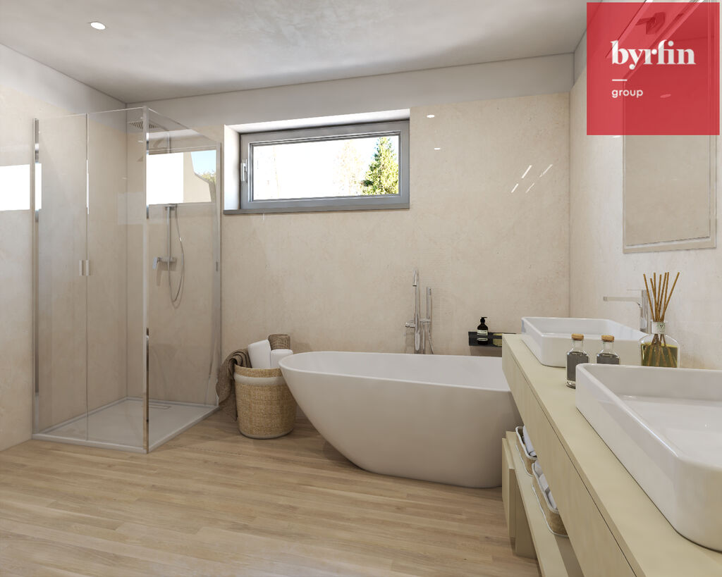 Vysoký standard provedení zahrnuje kvalitní plastová okna s trojsklem v barevném provedení antracit a venkovní elektrické žaluzie v každé místnosti, již v základním standardu – tedy v tzv. kolaudačním minimu.