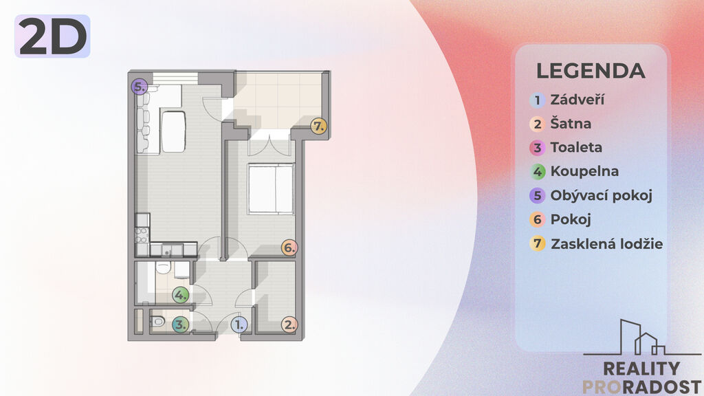 Vstup do bytu vede přes velmi prostorné zádveří, které poskytuje přístup do samostatné šatny, toalety a koupelny s vanou. Dále se z něj dostanete do ložnice a do obývacího pokoje, jenž spojuje jídelní a obývací prostor. Z obývacího pokoje i z ložnice je zajištěn přímý vstup na prostornou, zasklenou lodžii o ploše 7,41 m², která rozšiřuje obytný prostor a nabízí příjemné místo k relaxaci.