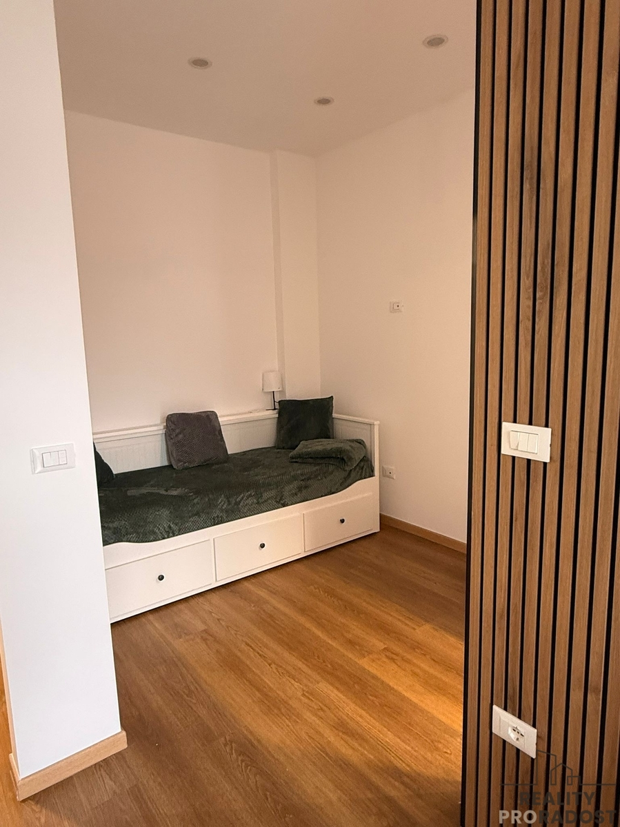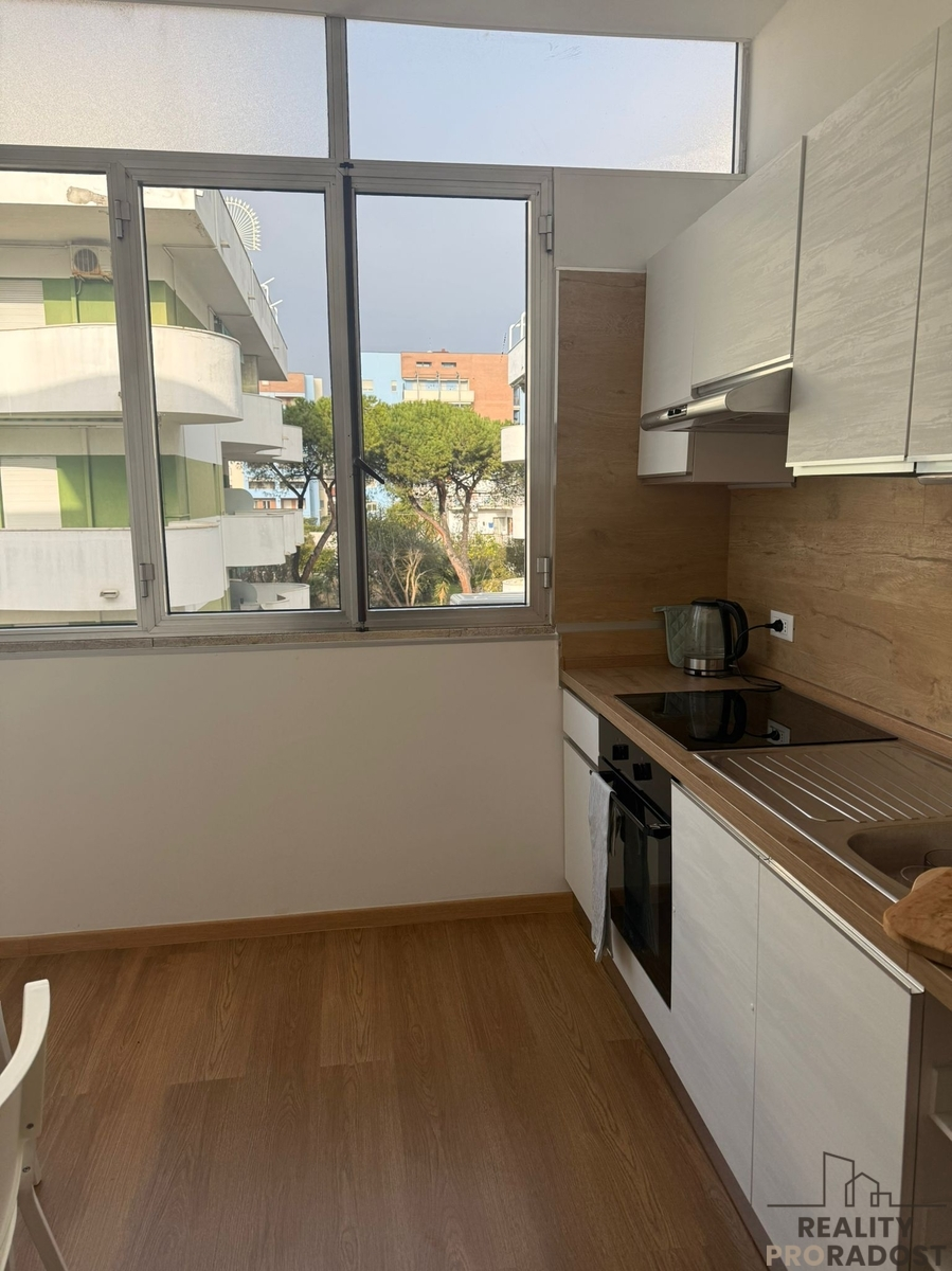 Dispozice bytu je promyšlená do posledního detailu. Zahrnuje útulnou ložnici, moderní koupelnu, světlý obývací pokoj a kuchyň propojenou s lodžií, která je celá zasklená otevíracími okny – vytváří tak jedinečný pocit, že stolujete přímo pod mořským nebem. Prostor působí otevřeně, vzdušně a mimořádně útulně.