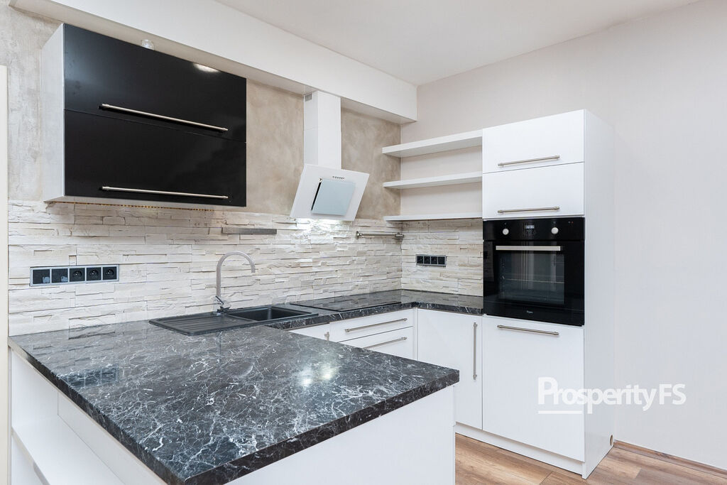 Interiér bytu je navržen s důrazem na estetiku a funkčnost, přičemž byly použity pouze vysoce kvalitní materály. Kuchyňská linka je vybavena vestavěnými spotřebiči prémiové značky, díky čemuž splňuje nejvyšší nároky na moderní bydlení. Celkovou atmosféru podtrhuje promyšlené osvětlení, které dává prostoru příjemný a útulný ráz.