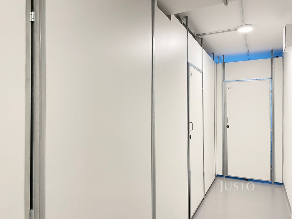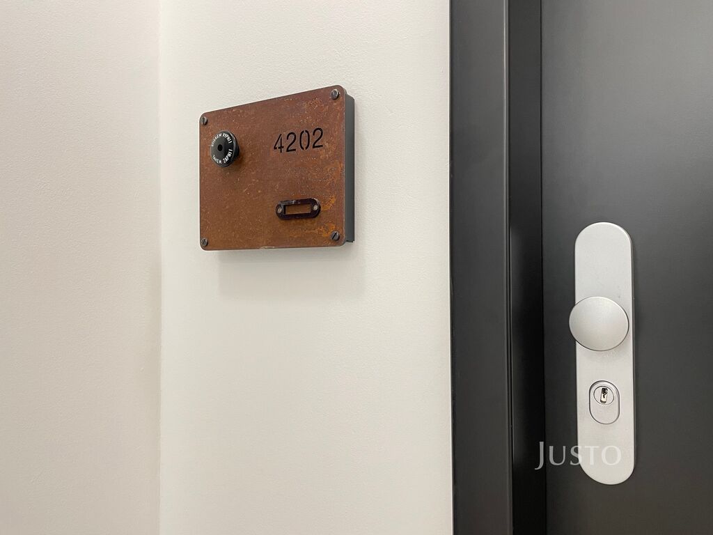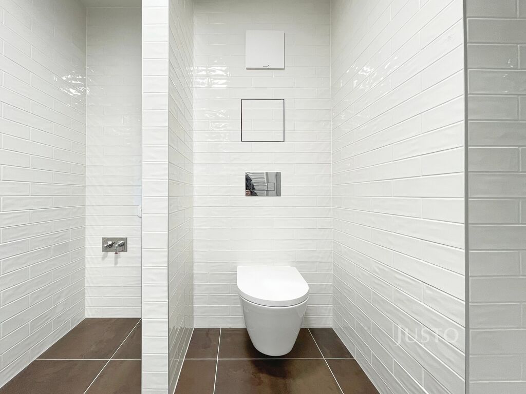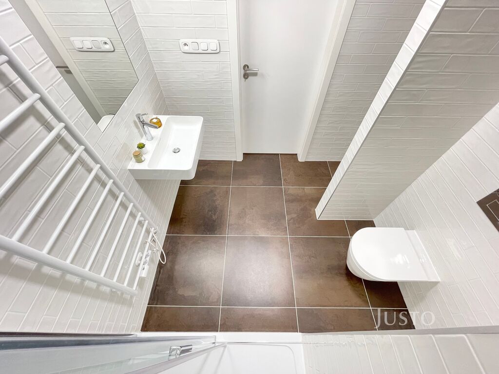 Koupelna se sprchovým koutem, toaletou a umyvadlem disponuje i dostatečným místem pro pračku a sušičku. Samostatná komora v bytě poskytuje další úložný prostor. Vstup do bytu od obývací a spací části oddělují posuvné prosklené dveře.