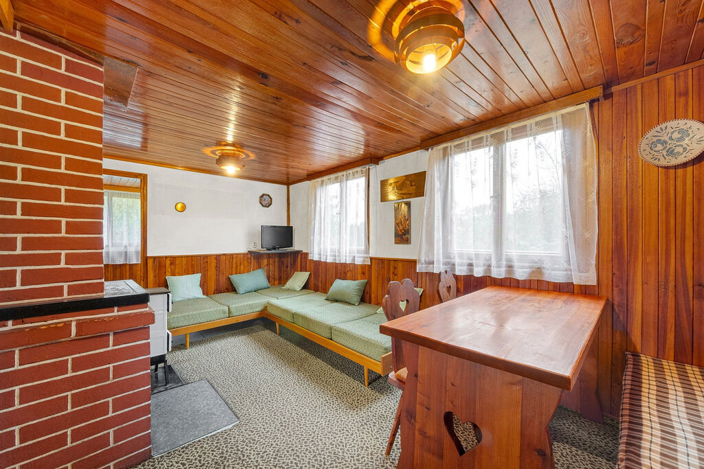 Za prosklenou verandou, u které se nachází i klasické WC, se rozkládá světlý obytný prostor s krbovými kamny, kuchyňkou a dvěma ložnicemi, který poskytuje pohodlí a dostatek místa pro rodinu i přátele – celková dispozice je 3+1.