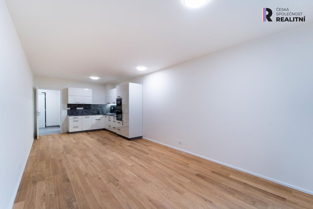 Prostorný obývací pokoj s novou, plně vybavenou kuchyňskou linkou