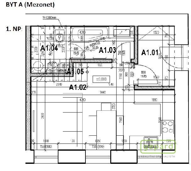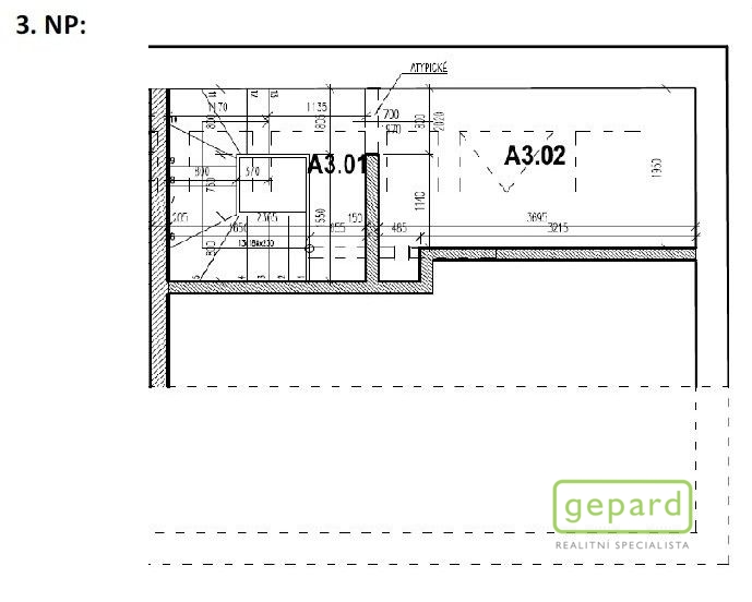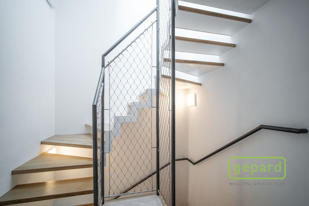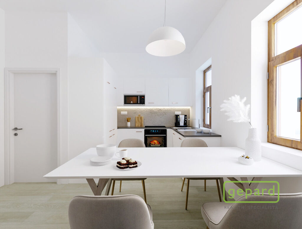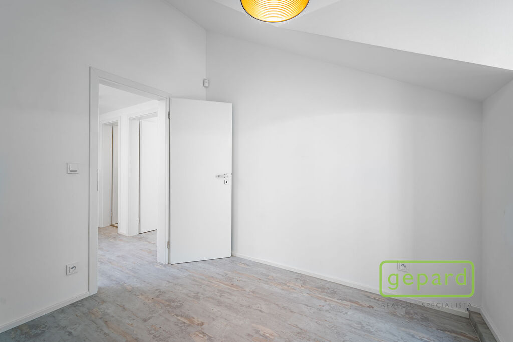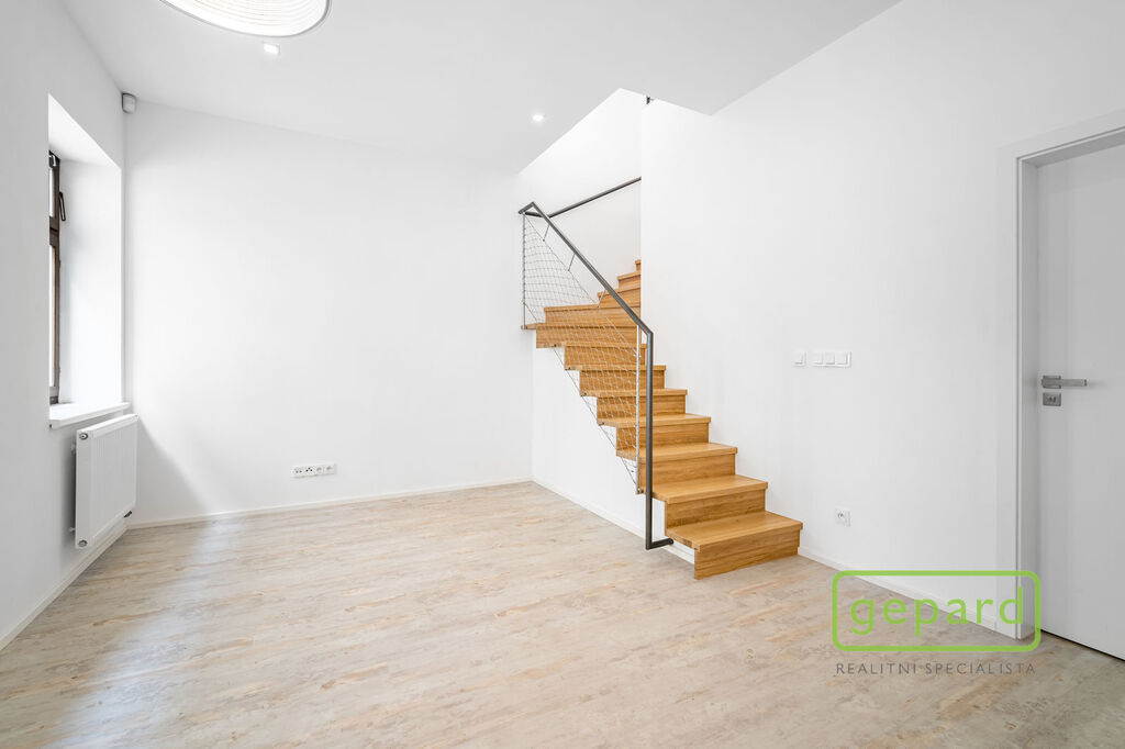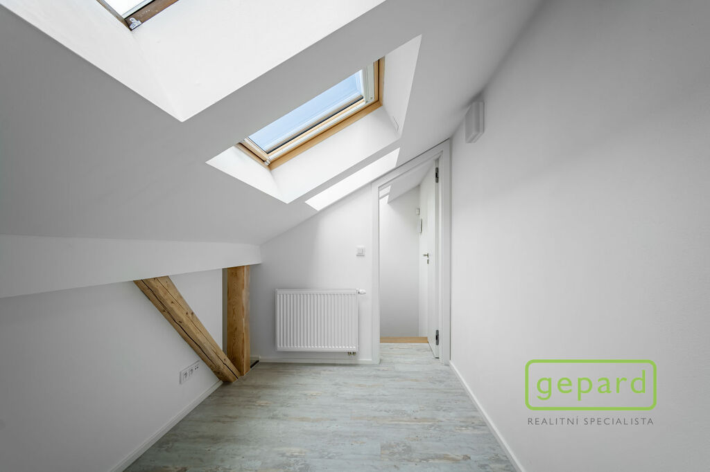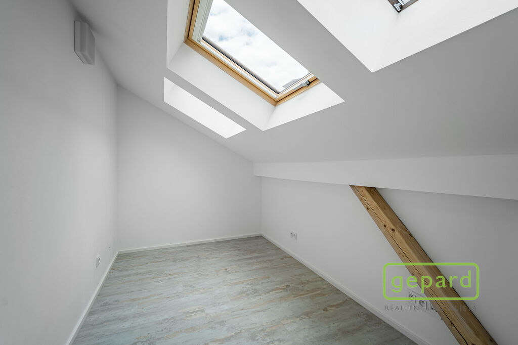 Popis bytu: při vstupu do bytu se ocitneme v menší předsíni s vestavěnou skříní, ze které vcházíme do obývacího pokoje s kuchyňským koutem. Z obývacího pokoje je vstup do koupelny a samostatného WC. Kuchyňský kout tvoří nová kuchyňská linka se sklokeramickou deskou, troubou, ledničkou, mrazákem a myčkou. Do druhého podlaží bytu se dostaneme schodištěm z obývacího pokoje v 1.NP. V této části bytu se nachází dvě ložnice a samostatné WC. U jedné z ložnic je šatna vybavená skříní se zrcadlem a šuplíky. Ve třetím podlaží bytu se nachází podkrovní malý pokoj (pracovna). U vstupu do bytu je předzahrádka, na které je možné umístit stůl a židle pro venkovní posezení.