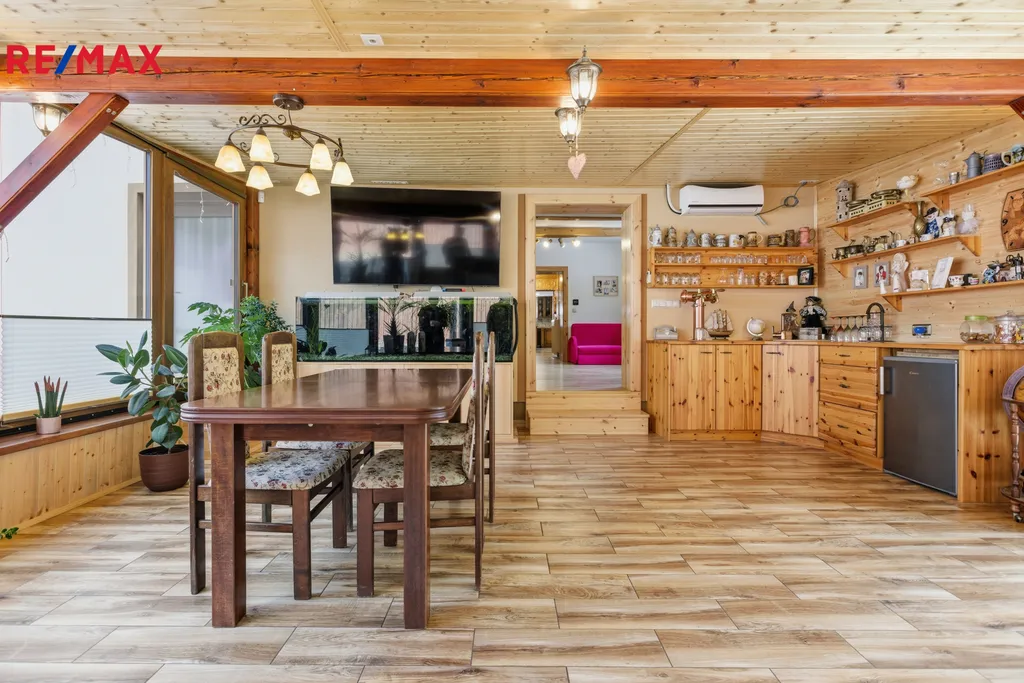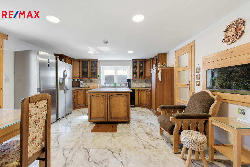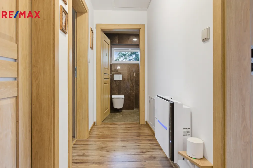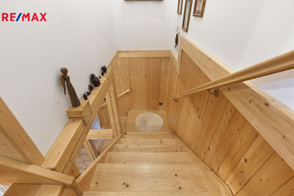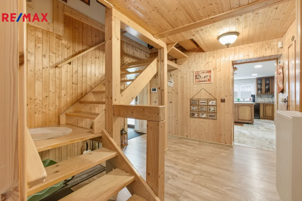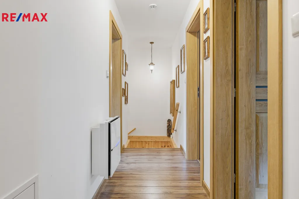 Interiér domu je laděný v přírodním stylu – dřevo dominuje podlahám, stropům i vestavěnému nábytku. První patro nabízí pracovnu, moderní koupelnu s WC, kuchyň, která důmyslně ukrývá pod posunovacím ostrůvkem sklep o velikosti 6m2 (zajištěno odvětrávání-cirkulace vzduchu), hernu pro děti, prostorný obývací prostor s jídelnou a kuchyní v otevřeném konceptu, technické zázemí a garáž. Kuchyňská linka na míru, bohaté úložné prostory, rustikální doplňky, krbová kamna a velké akvárium pod televizí tvoří jedinečnou atmosféru. Ve druhém patře najdeme několik ložnic a koupelnu s WC. Schodiště a detaily z masivu vytváří útulný, ale zároveň reprezentativní vzhled. Nad garáží je prostorná půda (cca 40m2) a nad domem také (cca 80m2), na kterou je přivedené topení což nabízí další možnost vybudovat podkrovní pokoje. Dům je moderně vybavený co se tyká ovládání. Má kamerový systém kolem celého domu a je napojen na bezpečnostní firmu Jablotron. Video telefon připojeny i ke vzdálenému přihlášení. Elektronické venkovní rolety představují moderní a efektivní řešení pro stínění, zabezpečení a tepelnou izolaci oken. Díky elektrickému pohonu a možnosti automatizace poskytnou maximální komfort a ochranu. Navíc přispívají ke snížení energetických nákladů.