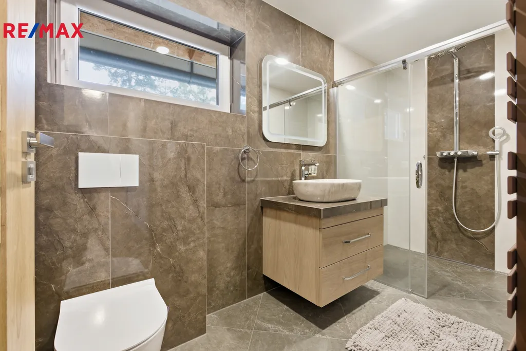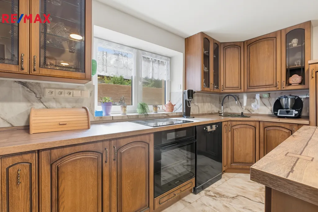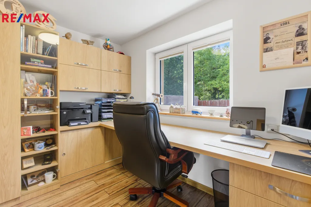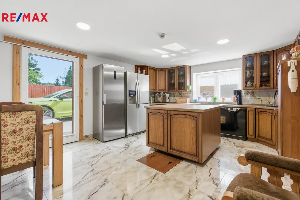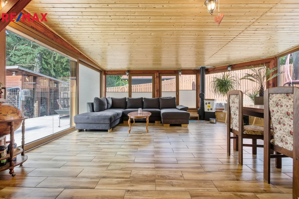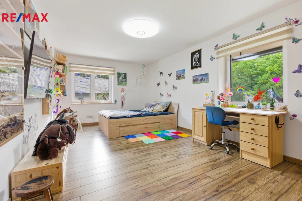 Interiér domu je laděný v přírodním stylu – dřevo dominuje podlahám, stropům i vestavěnému nábytku. První patro nabízí pracovnu, moderní koupelnu s WC, kuchyň, která důmyslně ukrývá pod posunovacím ostrůvkem sklep o velikosti 6m2 (zajištěno odvětrávání-cirkulace vzduchu), hernu pro děti, prostorný obývací prostor s jídelnou a kuchyní v otevřeném konceptu, technické zázemí a garáž. Kuchyňská linka na míru, bohaté úložné prostory, rustikální doplňky, krbová kamna a velké akvárium pod televizí tvoří jedinečnou atmosféru. Ve druhém patře najdeme několik ložnic a koupelnu s WC. Schodiště a detaily z masivu vytváří útulný, ale zároveň reprezentativní vzhled. Nad garáží je prostorná půda (cca 40m2) a nad domem také (cca 80m2), na kterou je přivedené topení což nabízí další možnost vybudovat podkrovní pokoje. Dům je moderně vybavený co se tyká ovládání. Má kamerový systém kolem celého domu a je napojen na bezpečnostní firmu Jablotron. Video telefon připojeny i ke vzdálenému přihlášení. Elektronické venkovní rolety představují moderní a efektivní řešení pro stínění, zabezpečení a tepelnou izolaci oken. Díky elektrickému pohonu a možnosti automatizace poskytnou maximální komfort a ochranu. Navíc přispívají ke snížení energetických nákladů.