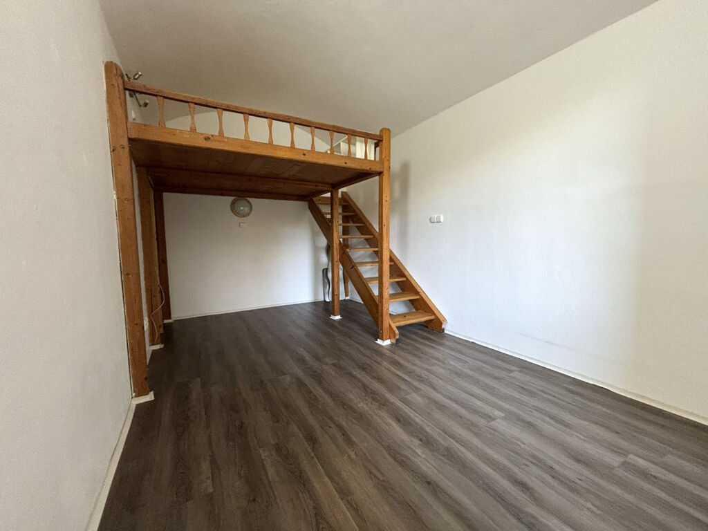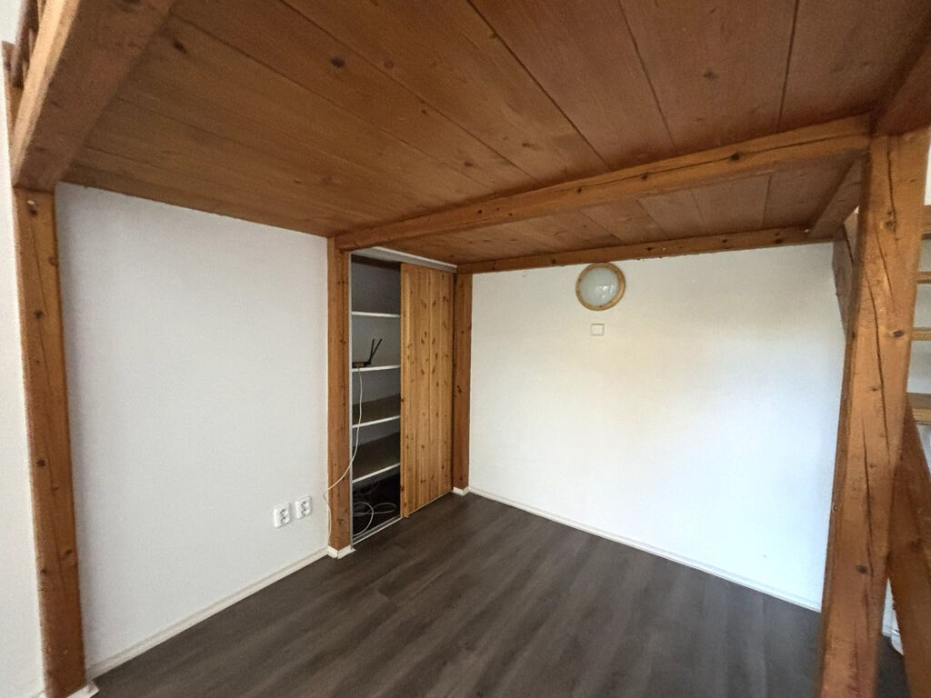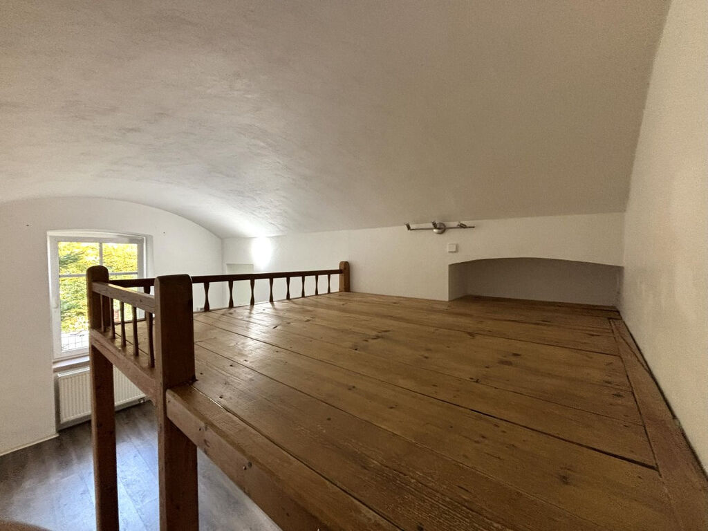 Obývací pokoj je nevybavený a jeho součástí je šatna a prostor na spaní se schodištěm situovaný v horní části pokoje.