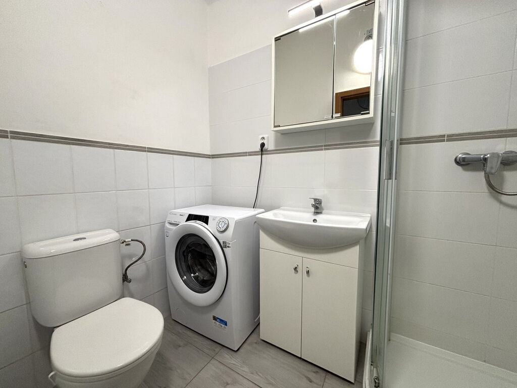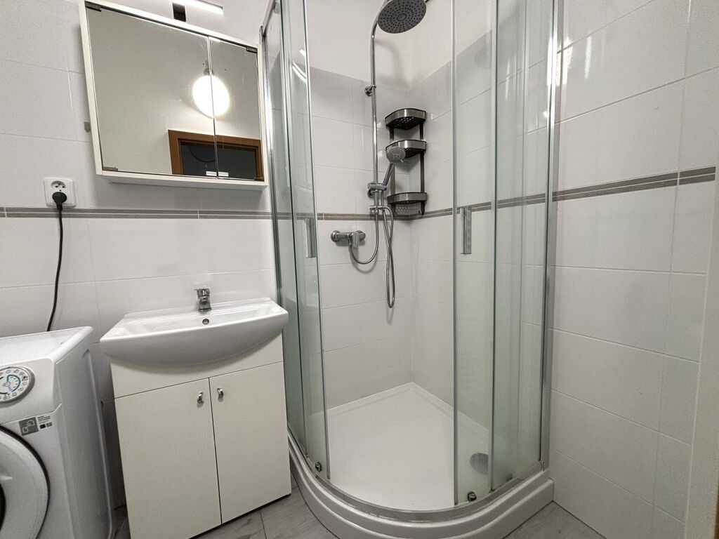 V koupelně nalezneme sprchový kout, umyvadlovou skříňku s umyvadlem a zrcadlem, a pračku.