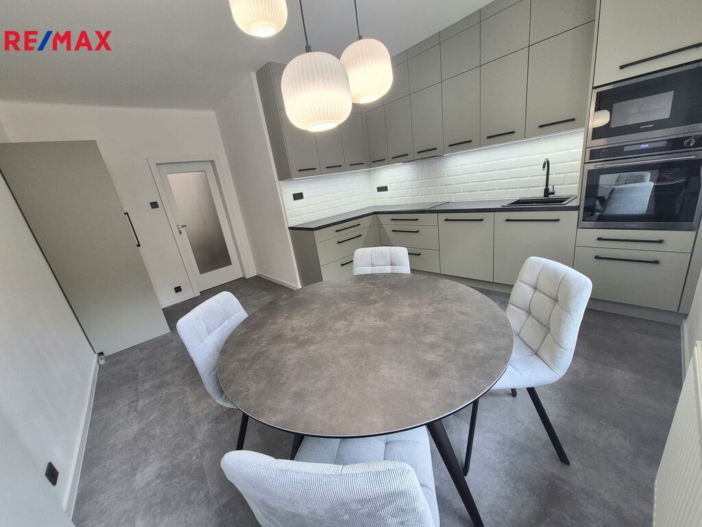 Kuchyň (cca 16 m²) je vybavena zcela novou kuchyňskou linkou se všemi moderními spotřebiči – indukční varnou deskou, horkovzdušnou troubou, mikrovlnnou troubou, myčkou, digestoří a dřezem. Součástí je také jídelní stůl a úložná skříň, vše v elegantním a sladěném designu.