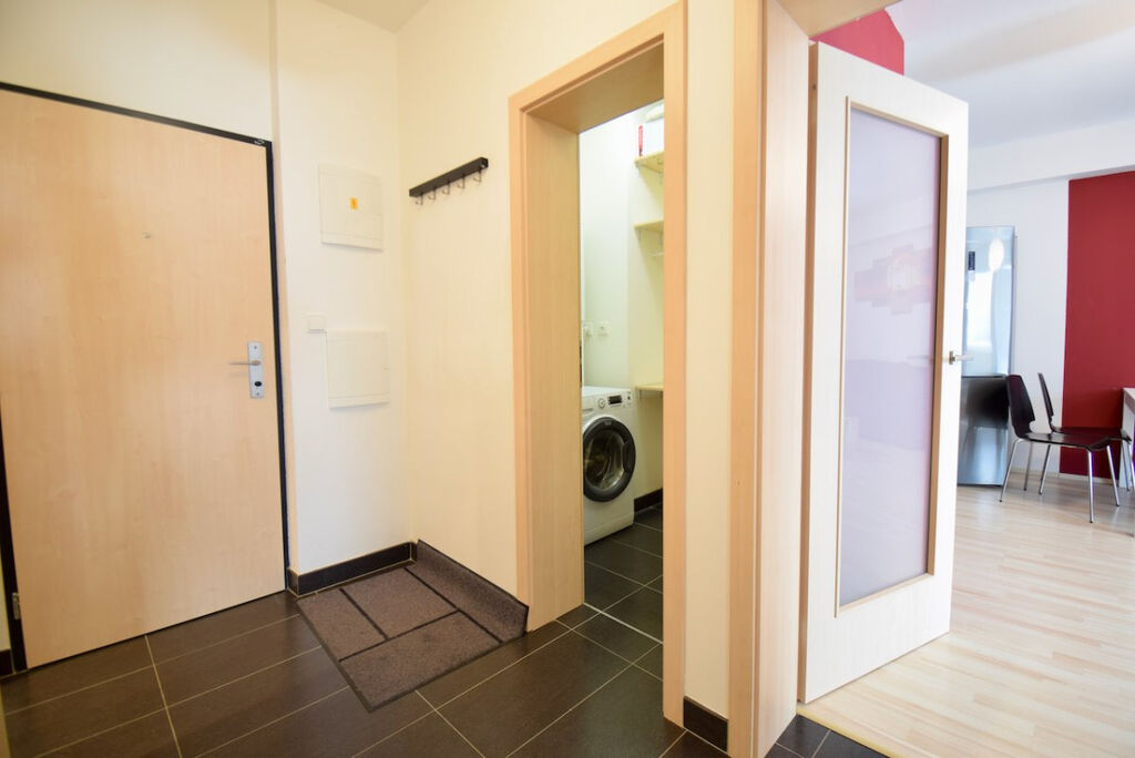 Byt se nabízí plně vybavený. V předsíni se nachází botník. Kuchyně disponuje všemi spotřebiči. Obývací část je zařízena gaučem, konferenčním stolem, obývací stěnou, jídelním stolem a židlemi. V prostorné ložnici se nachází postel, skříň a pracovní stůl. Koupelna je vybavena vanou, umyvadlem, komorou s pračkou a úložným prostorem.