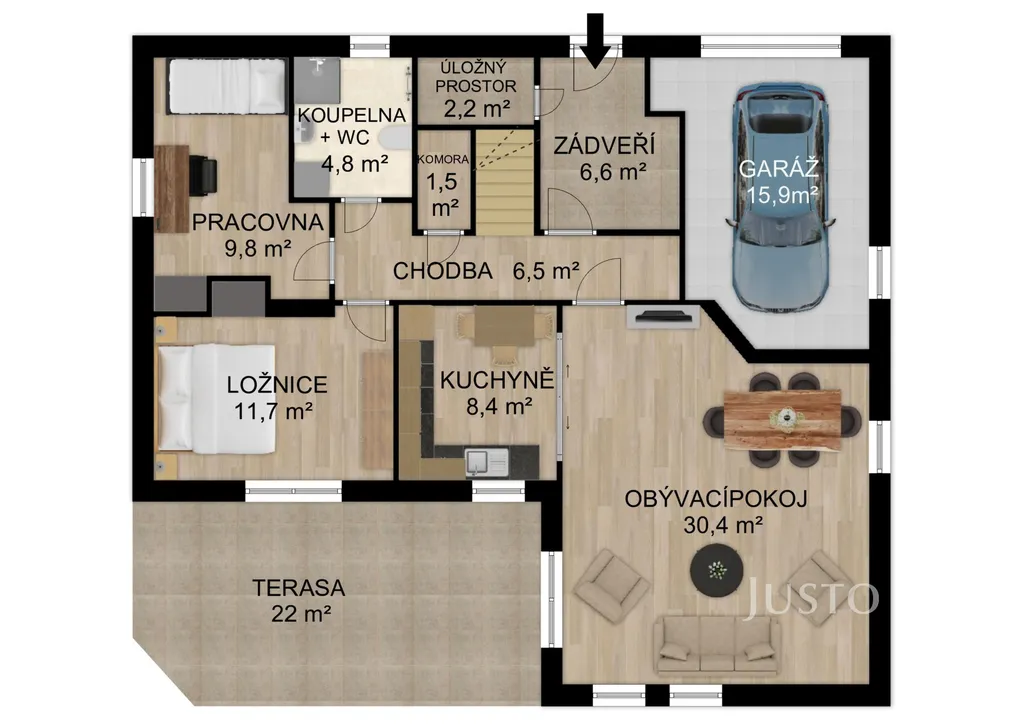 Obytná plocha domu (bez garáže a terasy): 115,9 m²