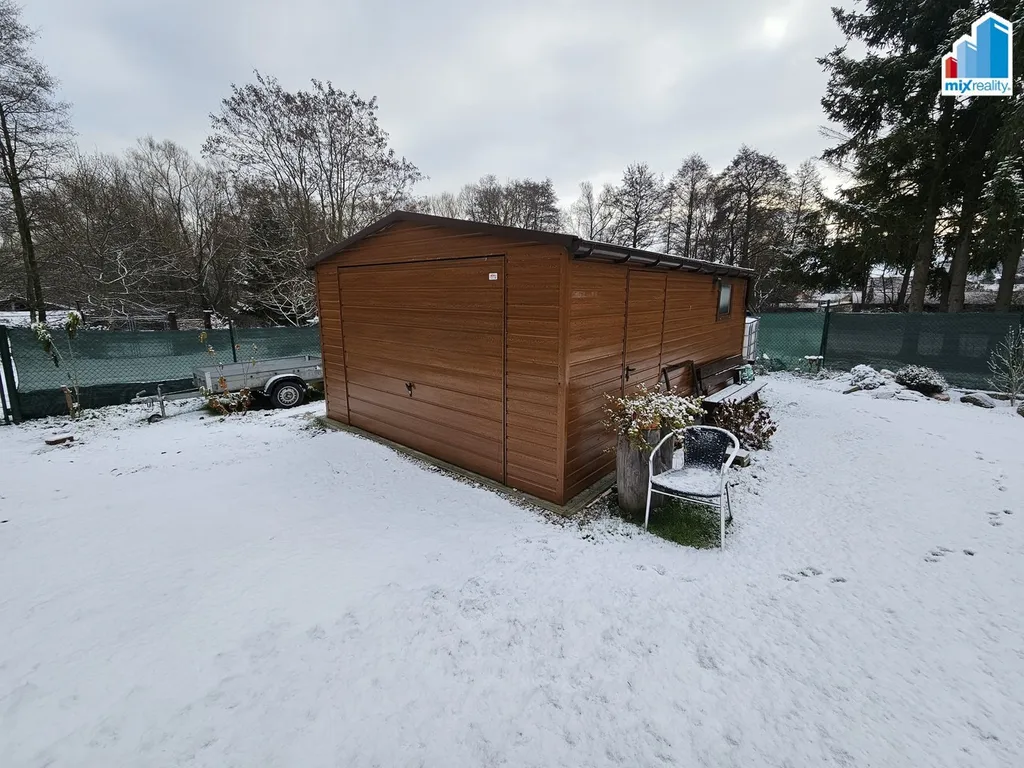 Součástí nemovitosti jsou dvě garáže, zahradní chatička a skleník, které rozšiřují možnosti využití pozemku.