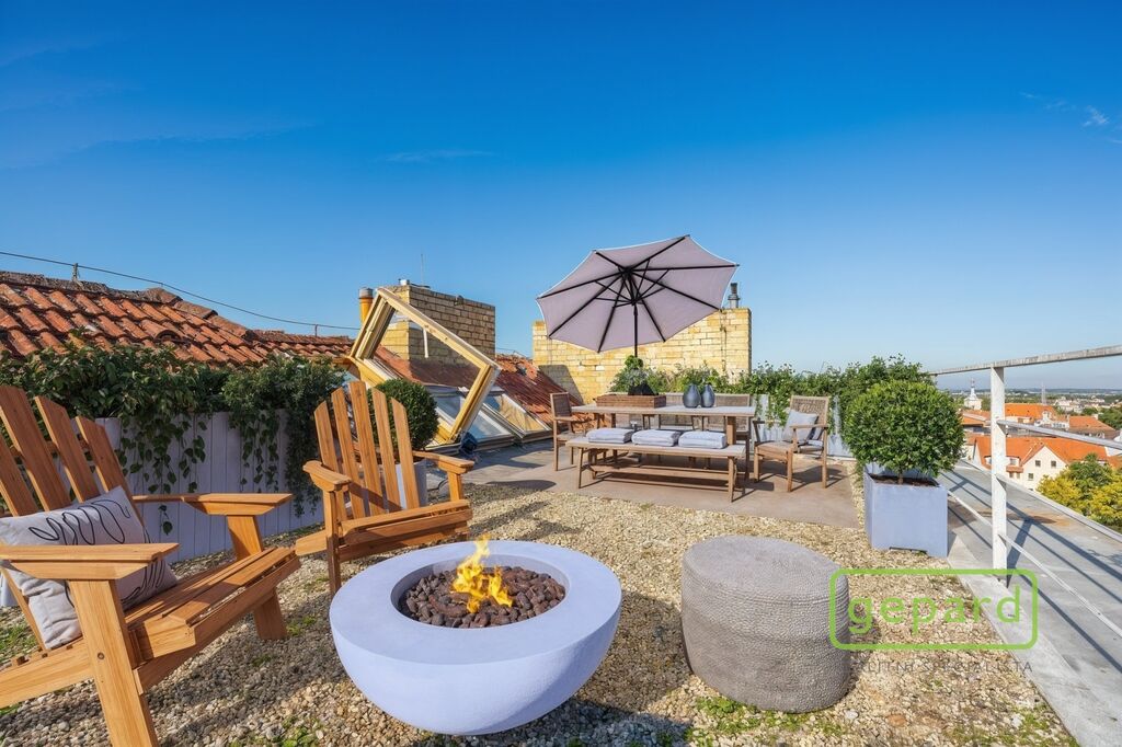 Třešničkou na dortu je soukromá střešní terasa o velikosti cca 50 m², kam vystoupáte vlastním schodištěm přímo z bytu – aktuálně jsou tam základní schůdky, ale máme pro vás vizualizaci možného řešení pro pohodlný přístup.