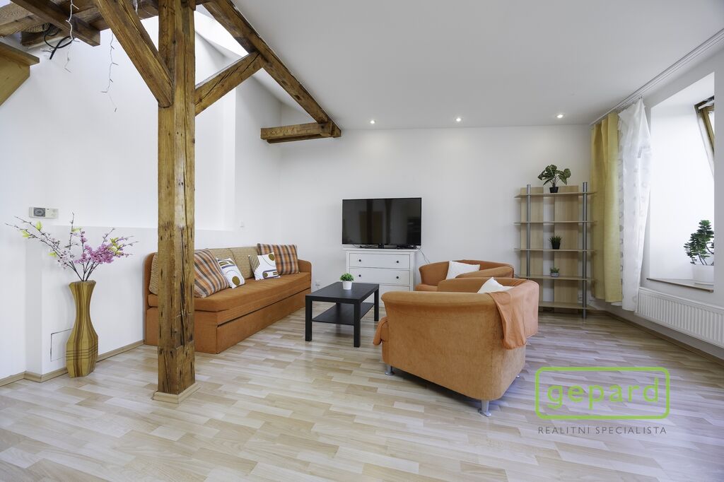 Byt má vysoké stropy s přiznanými trámy, přirozené světlo a naprosto jedinečnou atmosféru.