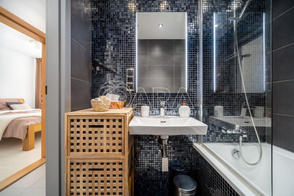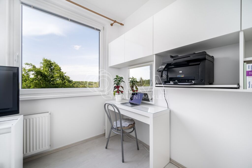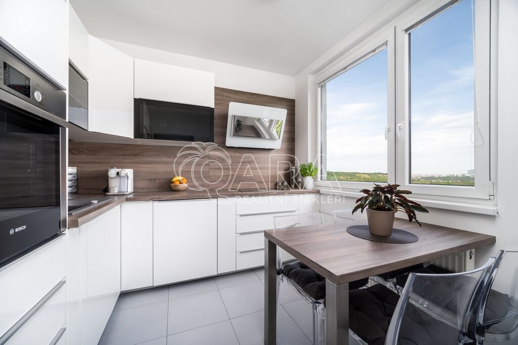 V kuchyni budete moci využívat kvalitní spotřebiče jako elektrickou troubu, indukční varnou desku, myčku, lednici s mrazákem vše zn. Bosch a digestoř zn. Elica. Ve všech pokojích jsou položeny plovoucí podlahy, v kuchyni, na chodbě, koupelně, WC a komoře je dlažba. V celém bytě jsou plastová okna, v obývacím pokoji jsou navíc osazena venkovními roletami s elektrickým pohonem. Ve všech místnostech jsou vyměněny topná tělesa za nová. Instalovány jsou bezpečnostní vstupní dveře zn. Sherlock. Zcela jistě oceníte i moderní zpracování koupelny a samostatné WC. Relaxovat u kávy budete moci na novém balkoně o velikosti 6 m2. Balkon s nádherným výhledem je i kompletně zasklený.