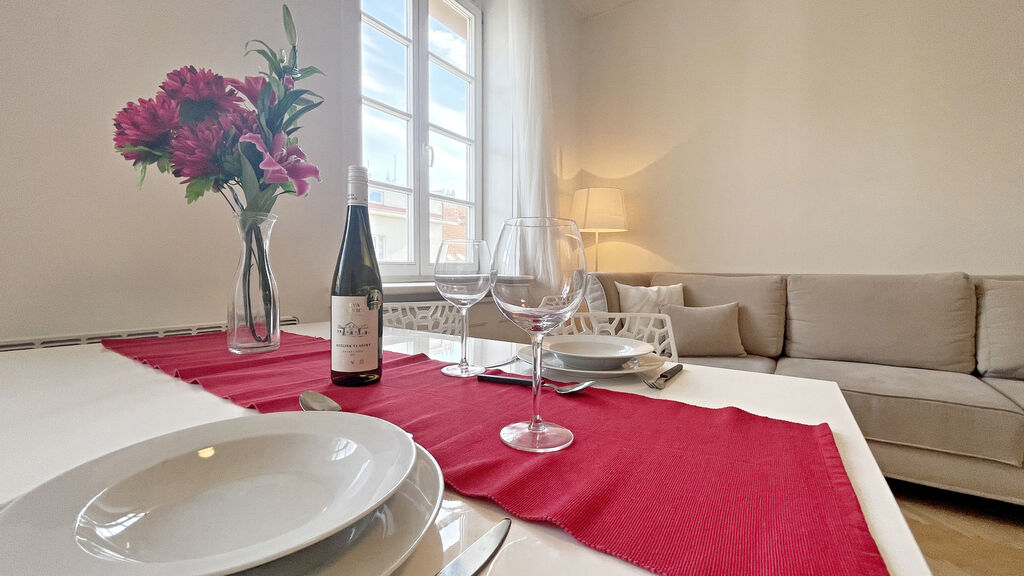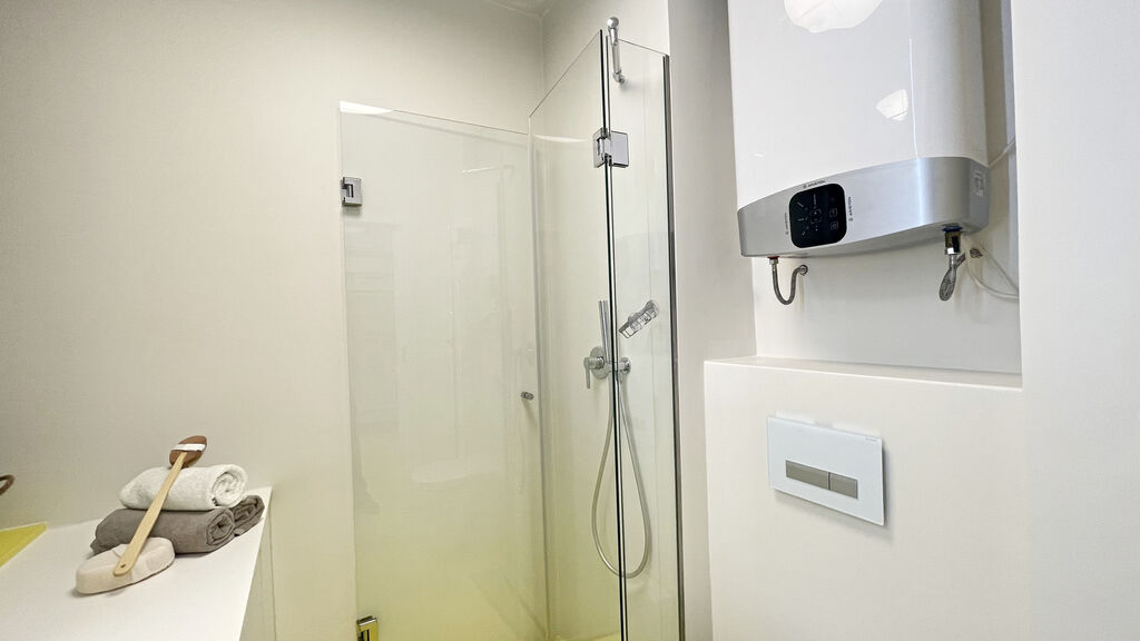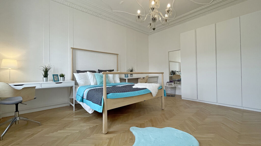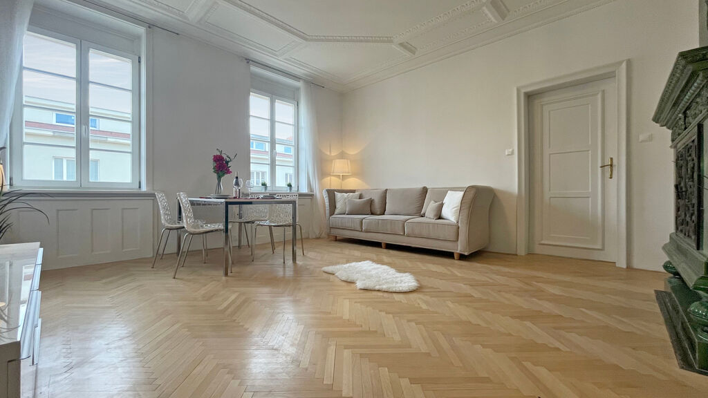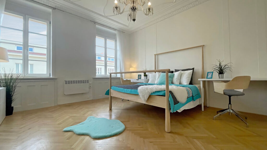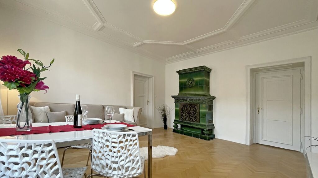 V obývacím pokoji byla zachována funkční historická kachlová kamna, která bytu dodávají osobitý charakter a atmosféru. V prostorná ložnici je k dispozici velká šatní skříň. Koupelna nabízí sprchový kout.