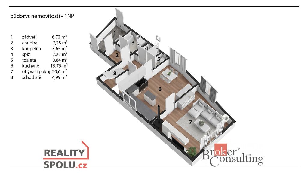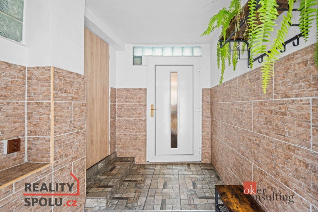Interiér je plně obyvatelný a připravený k nastěhování. Dispozičně je dům velmi praktický. V přízemí se nachází předsíň, chodba, samostatné WC, koupelna/technická místnost, kuchyně s jídelním koutem a neprůchozí obývací pokoj orientovaný směrem do zahrady. V patře pak ložnice, pokoj a koupelna s WC. V podkroví je dalších 60m2, které je možno využít jako další skladovací prostor. A sklep? Ten má dům také.