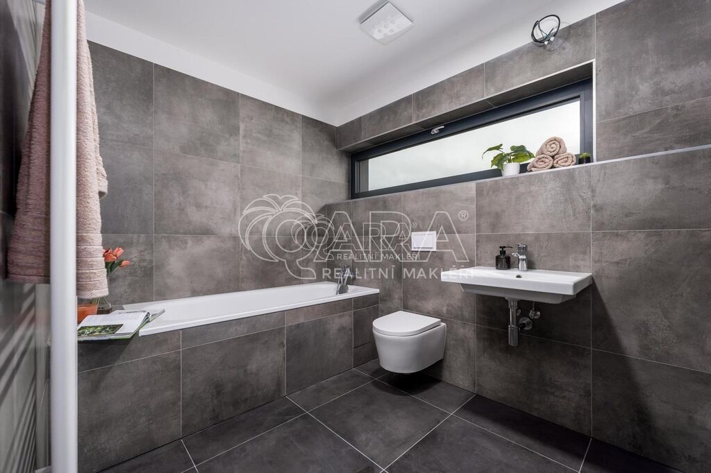 Stejně jako obytná část tak i koupelna nabízí krásné výhledy na strakonický hrad, ve které se nachází přípojka na pračku. Ohřev teplé vody zajištuje boiler, který je umístěn ve vestavěné skříni v předsíni.