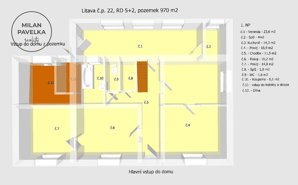 Vstup do domu - 1. NP: chodba, spíž, kuchyně, sociální zařízení, tři pokoje a schodiště do 2. NP. Zde jsou dva pokoje, kuchyně a velký půdní prostor. Pod střechou s pálenými taškami se nachází půdní prostor, který nabízí možnost vybudování zajímavého podkrovního pokoje.