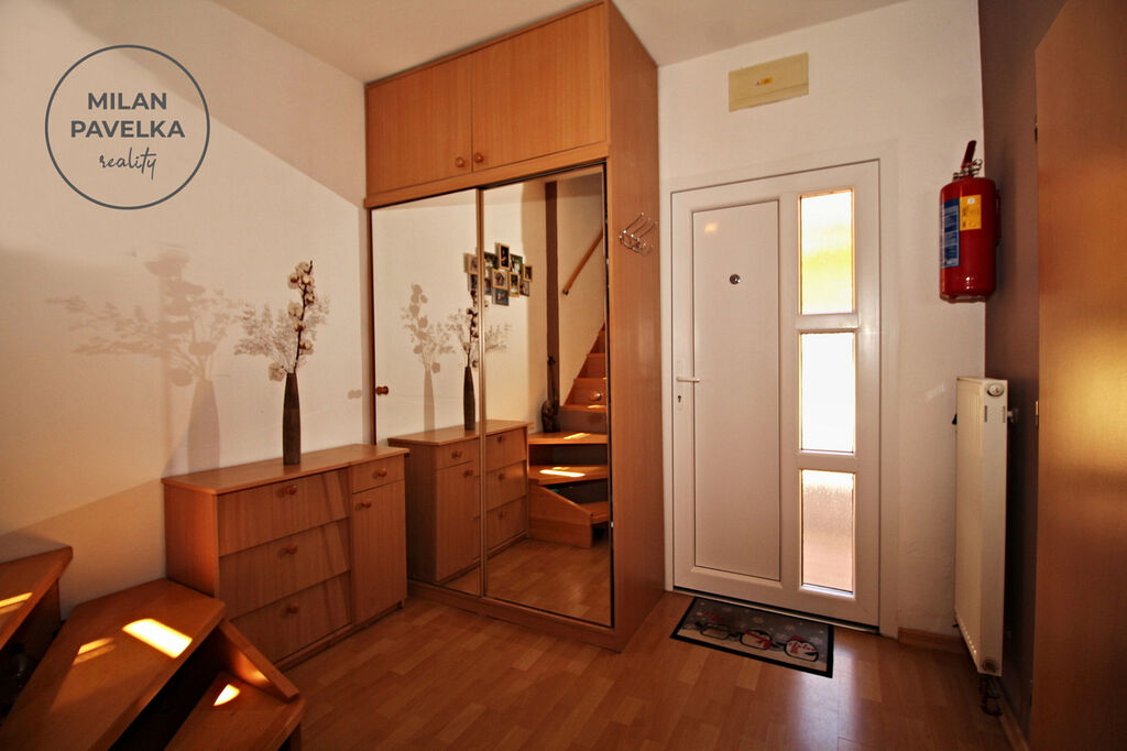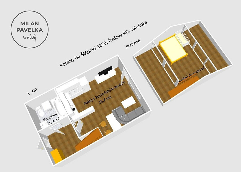 Po vstupu do zádveří, odkud je vstup do koupelny s WC o výměře 5,3 m² a schodiště do podkroví, dále před Vámi se otevře světlý a prostorný obývací pokoj s kuchyňským koutem o výměře 25,7 m² a dále vstup na terasu s posezením a se zahrádku o celkové výměře 24 m².