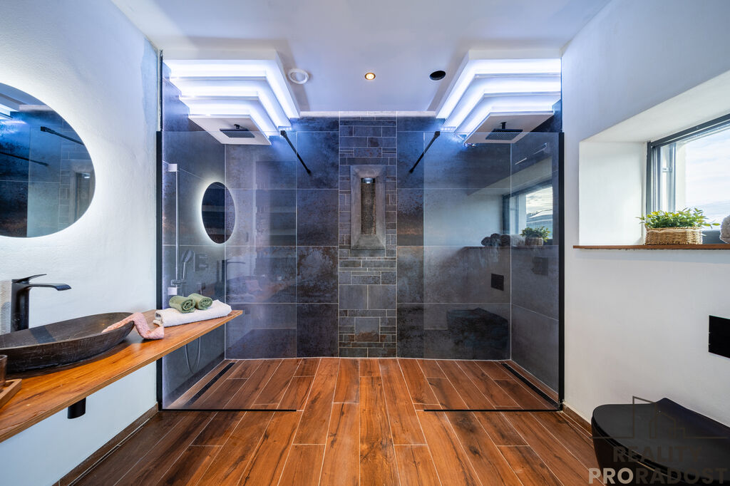 Novostavba rodinného domu 5+kk s garáží na lukrativním místě ve Včelné u Českých Budějovic. Tento dům je výsledkem architektonického studia pana Vostrackého a poznáte to zde na každém detailu. Jeho prosklená jižní část s obrovskými francouzskými okny HS-portal Vás jednoduše bude bavit. A to, jak si pan architekt pohrál s různými přesahy střechy, aby využil maximum slunečního svitu, aniž byste museli zatahovat venkovní elektrické rolety, resp. aby je chytrá domácnost od firmy LOXONE nemusela spouštět za Vás, je brilantní. Dům je prošpikovaný nejnovějšími technologiemi od této značky jako je tepelné čerpadlo (země - voda), pasivní chlazení, vynikající audio systém s reproduktory v každé místnosti, příprava na rekuperaci a příprava na ohřev bazénu a jiné. Je zde i příprava na teplovodní krb. Dispozice domu nabízí dva dětské pokoje na jedné straně, uprostřed dominantu v podobě obrovského obývacího pokoje s místem na krb se zadním přikládáním a s kuchyní a na protější straně dvě ložnice s druhou koupelnou. Dalšími benefity jsou prostorná šatna a garáž + venkovní kryté stání. Dále je potřeba zmínit vinylové podlahy, HS-portal v kombinaci dřevo-hliník ve třech pokojích se vstupem na zahradu, na střeše plastovou folii a zahradu o rozloze 611 m2, která čeká na Vaše nápady. Dům najdete ve slepé ulici s klidovou zonou s ohništěm a dětským hřištěm uprostřed, takže své ratolesti můžete bez starostí nechat řádit na ulici. V domě zbývá zbudovat krb, oplotit pozemek a dokončit zahradu dle Vašich představ. Dům se prodává v aktuálním stavu. Dle přání kupujícího může být dodána nová kuchyně, dodělána druhá koupelna, vyměněny podlahy i dodány interiérové dveře, jejichž cena není součástí kupní ceny. Více informací v RK.
