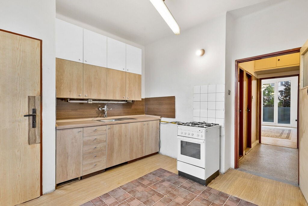 Dispozice bytu je velmi praktická – tvoří ji prostorná vstupní chodba, dvě samostatné obytné místnosti a kuchyň se zachovalou kuchyňskou linkou a místem pro jídelní stůl.