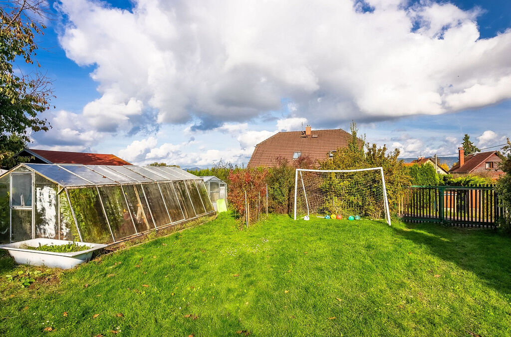 Rovinná zahrada o rozloze 512 m² s mírným sklonem nabízí dostatek prostoru pro posezení, zahradničení, dětské hry i menší bazén. Slunná orientace pozemku zajišťuje dostatek světla po celý den a místo působí příjemně klidnou atmosférou.