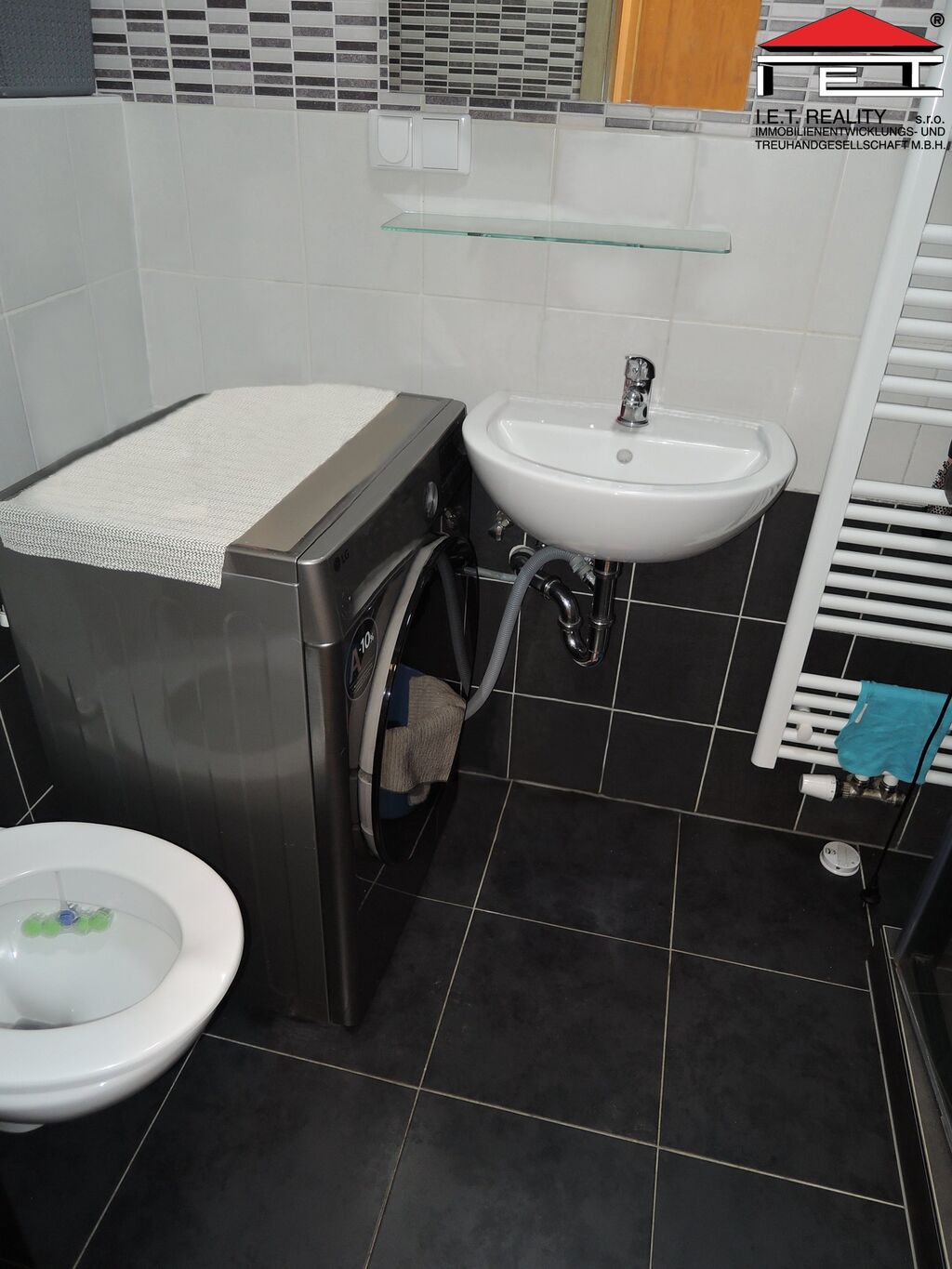 Koupelna se sprchovým koutem a wc, ohřev vody bojlerem. Místnost má velké francouzské okno, orientované do vnitrobloku - do zahrádky.