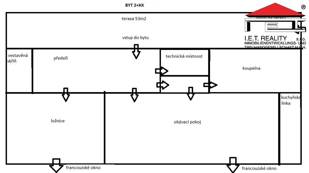 Druhý byt má vlastní samostatný vchod z ulice K Celinám, jedná se o 2+kk o výměře cca 45m2 + vlastní terasa 53m2 a parkovací místo u domu. Dispozičně se skládá z prostorné předsíně, obývacího pokoje s kuchyňským koutem (kuchyňská linka se spotřebiči), dále samostatná ložnice, technická místnost s bojlerem a pračkou a opravdu velkorysá koupelna, ze které bude nadšená hlavně paní domu.