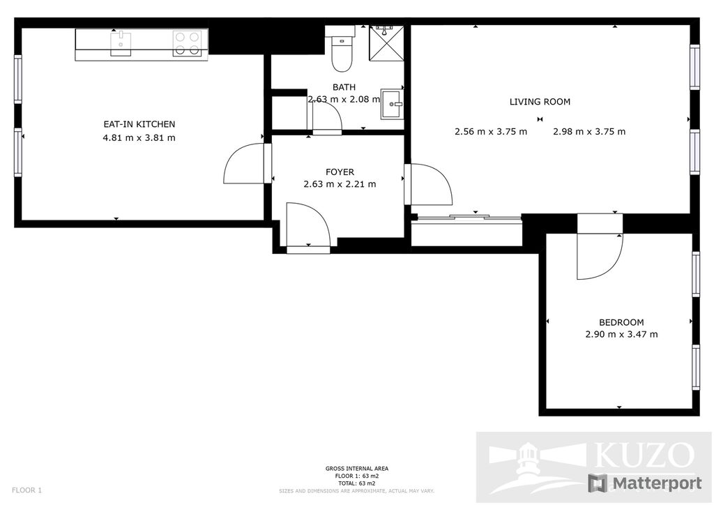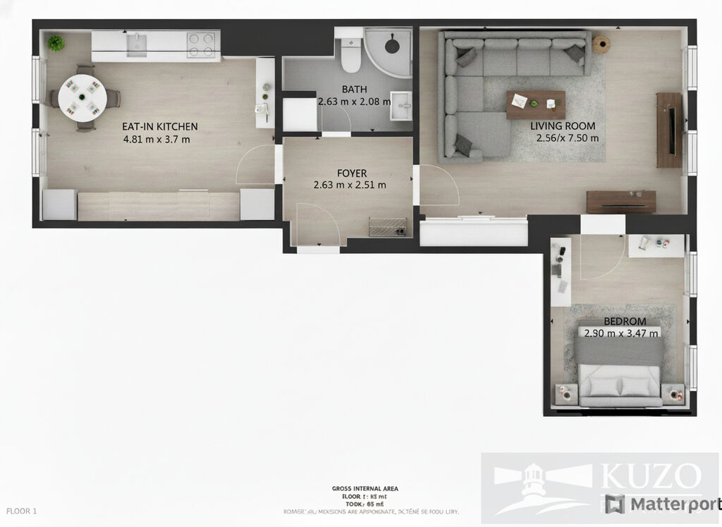 Velkorysý prostor: 63 m² ve standardní dispozici 2+1 s velkou jídelní zónou.