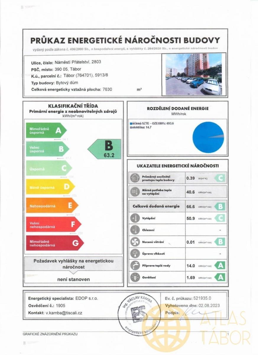 Nabízíme k prodeji byt o dispozici 2+kk v Táboře na náměstí Přátelství. Byt o podlahové ploše 39,01 m2 je situovaný v osmém patře kompletně revitalizovaného (nová fasáda, zateplení domu, odpady a voda v plastu) panelového domu s osobním a nákladním výtahem. Byt je v původním stavu, ale velmi pečlivě udržovaný. Dispozice bytu vstupní chodba s prostorem pro vestavěné skříně, koupelna s vanou, samostatné WC, ložnice a obývací pokoj spojený s kuchyňským koutem. Dispozice bytu je znázorněna na přiloženém půdorysu v inzerci. Výhodou nabízené nemovitosti jsou velmi nízké náklady spojené s užíváním bytu, které včetně fondu oprav činí 2.954,- Kč/měs. (bez elektrické energie v bytě) a veškeré závazky spojené s revitalizací bytového domu jsou již splaceny. Byt je vhodný pro vlastní bydlení, přímo ideální jako startovací bydlení nebo i na investici s následným pronájem. V současné době je byt obsazen platícím nájemníkem s nájemní smlouvou do 31.5.2026. Vytápění a ohřev vody je zajištěn dálkovým přívodem. V okolí domu je veškerá občanská vybavenost (škola, školka, obchody, lékař), dětská hřiště a relaxační areál Komora. Zastávka MHD v pěší dostupnosti. Pro domluvení prohlídky kontaktujte makléře zakázky. Na energetickém štítku je uvedena třída B, tj. velmi úsporná. Pro domluvení prohlídky kontaktujte makléře zakázky.