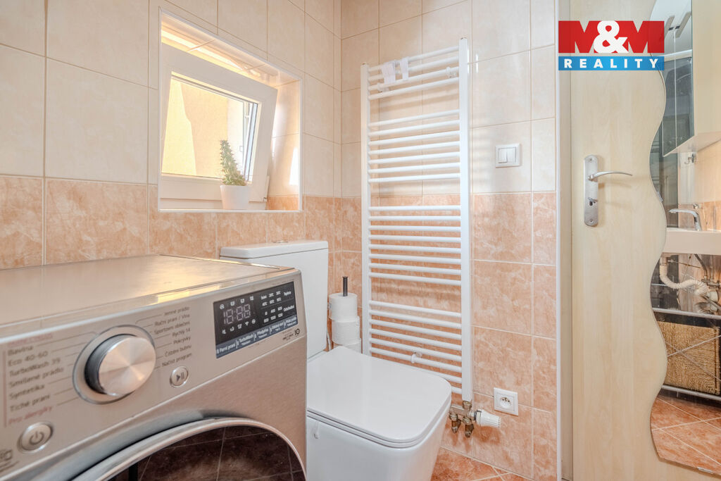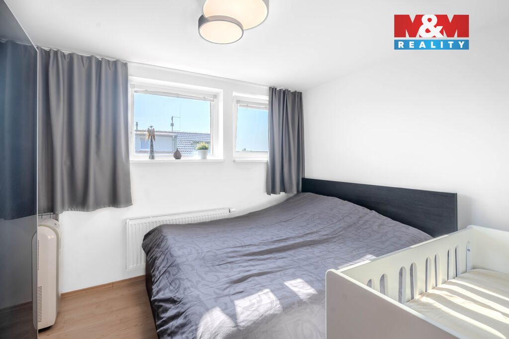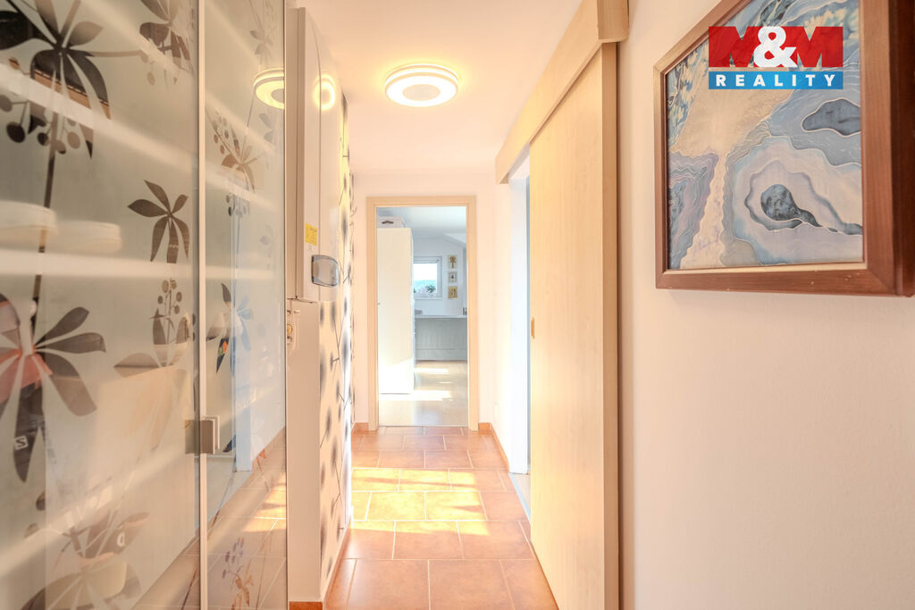 Ložnice a obývací pokoj se pyšní klimatizací pro komfortní bydlení i v létě a spousty úložného prostoru ve formě vestavných skříní v chodbě a ložnici.