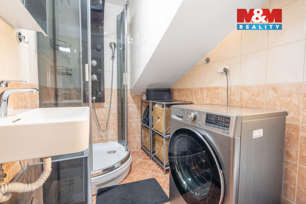 Koupelna se sprchovým koutem je spojena s toaletou.