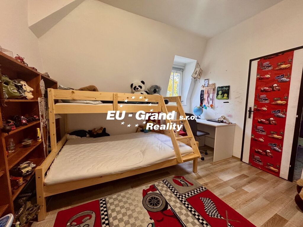 V patře je koupelna s WC, ložnice se vstupem na balkon do zahrady, dva dětské pokoje, šatna a pracovna.