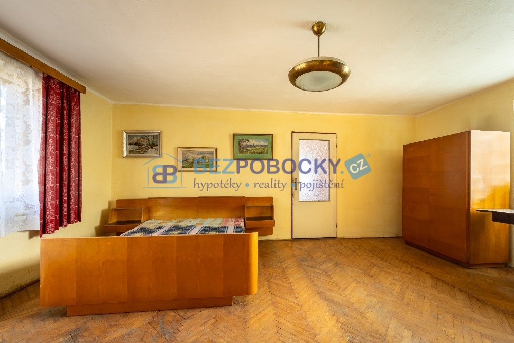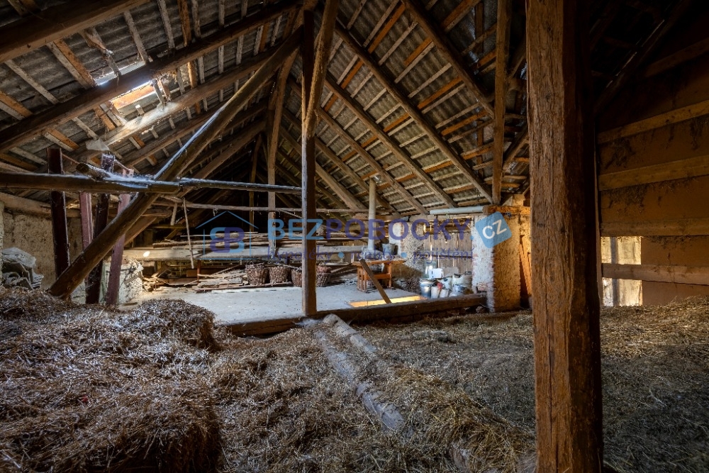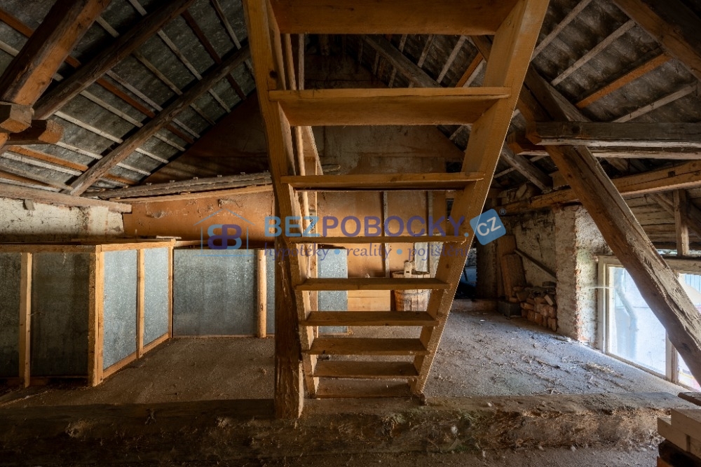 V patře jsou dva velké pokoje, jeden menší pokoj a vstup na půdu, která je nad celým domem i stodolou a ze které lze vybudovat další obytné pokoje.