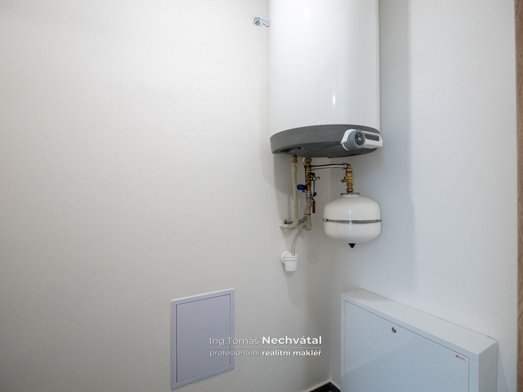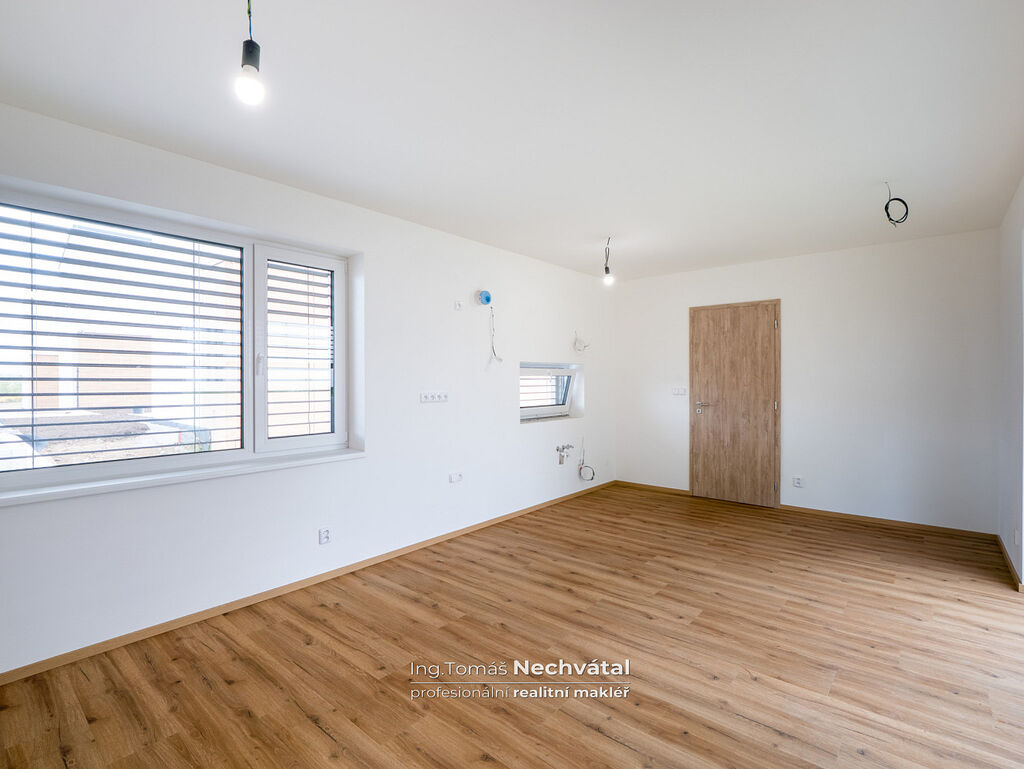 Kvalitní vinyl s příjemným povrchem v obytné části, v koupelně pak moderní velkoformátová dlažba. Celek podtrhují vysoké interiérové dveře, které prostor krásně otevřou a dodají mu pocit vzdušnosti.