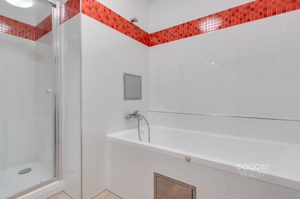Po vstupu do bytu se ocitnete v předsíni vybavené vestavěnou skříní. Z předsíně (ve tvaru L) je vstup do dvou samostatných místností (14,6 m2 a 14,4 m2), jež obě nabízí vchod na předzahrádku. Dále vedou z předsíně dveře do obývacího prostoru (27,1 m2) spojeného s kuchyňským koutem. Dále se z této předsíně dostanete do koupelny, jež je vybavena jak velkým sprchovým koutem tak vanou, takže na své si přijdou milovníci obou těchto variant. WC je samostatné a sousedí s koupelnou.